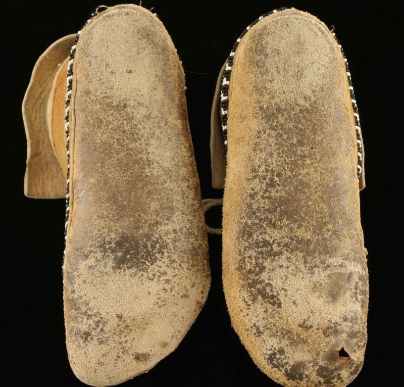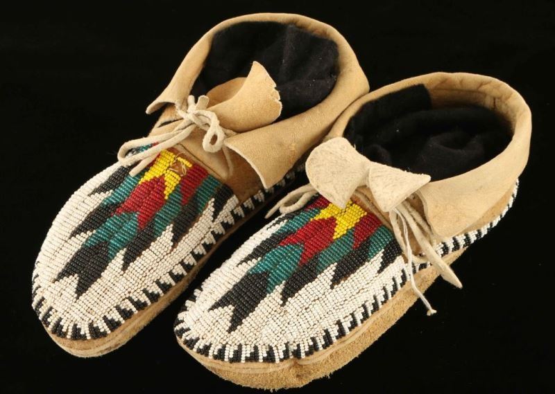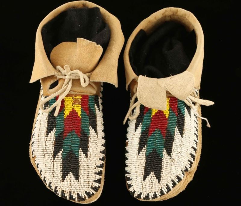 Geometric arrow design, in black, white, green, red and yellow. 1950s-60s type. Minor loss to yellow beadwork on one moccasin otherwise good.