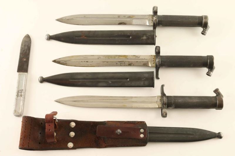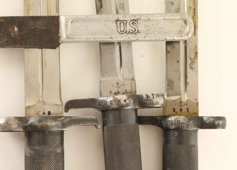 Including; bayonet marked '149' and 'L.A.B.' in metal and leather belt sheath with an 8" blade, 13" overall, bayonet marked 'FJ AR' with crown and anchor and '941' with an 8" blade, 13" overall in metal sheath, bayonet marked 'FJ AR' with crown and anchor and '291' with an 8" blade, 13" overall in metal sheath. Also includes 'U.S.' marked knife from A.C. Co. 1917 measures 7 1/4" overall.