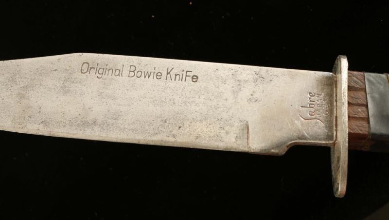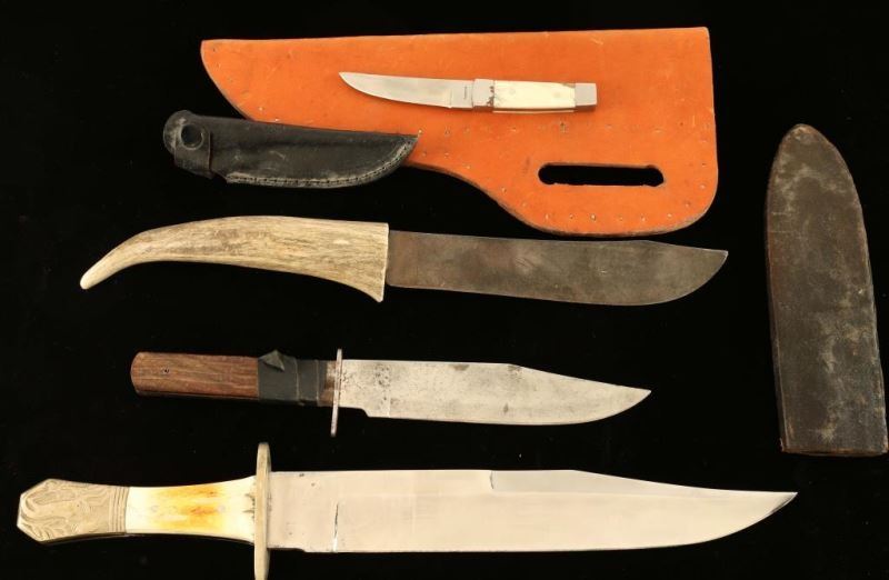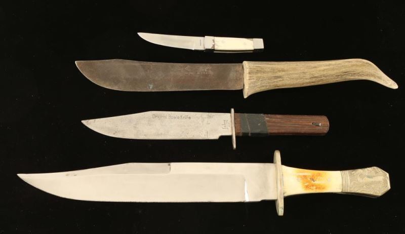 Including; large bowie knife with faux bone handle and molded silver end with horse motif in leather sheath with tack design, faux antler handled knife, mini knife with faux bone handle in leather sheath. and a Sabre wood handled 'Original Bowie Knife' in leather sheath-kept together with electrical tape.