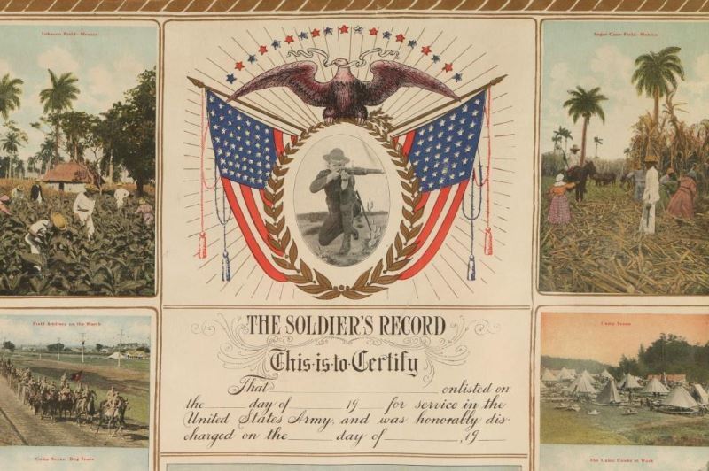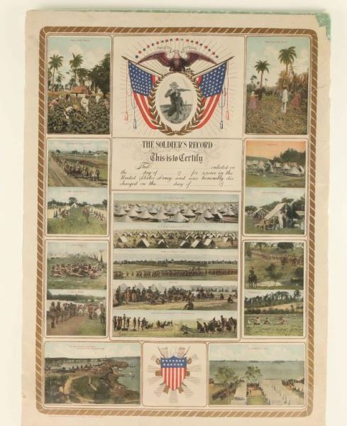 Depicting scenes of training, "The Soldier's Record' certifies date of enlistment in the United States Army until date of honorable discharge. Measures 24 3/4" x 18". Part of right corner is missing and creases throughout poster otherwise good.