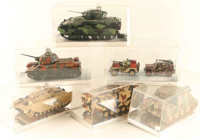 Including: (2) of US Jeeps, German WWII Tank, Russian WWII Tank, US Amphibian Tank, German WWII Tank, and a US Bradley Tank. All are encased in plastic and measure 9"x4 3/4"x4 1/2"