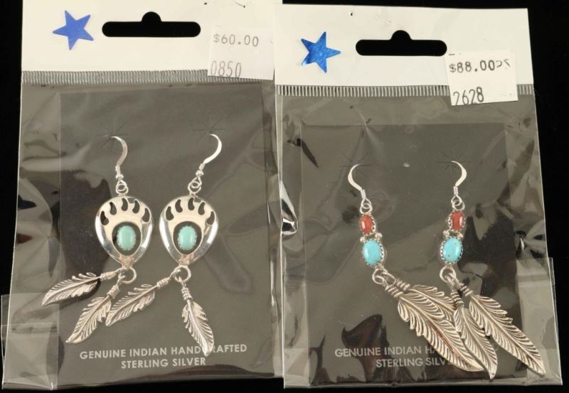 Navajo made Kingman turquoise bear paw earrings with feather dangles and a pair of natural turquoise and coral earrings with dangling silver feathers.