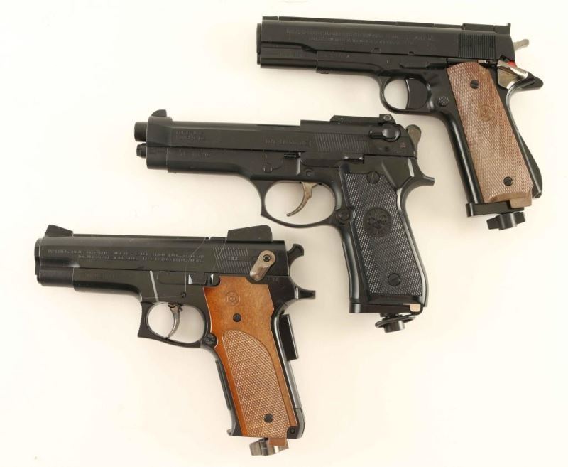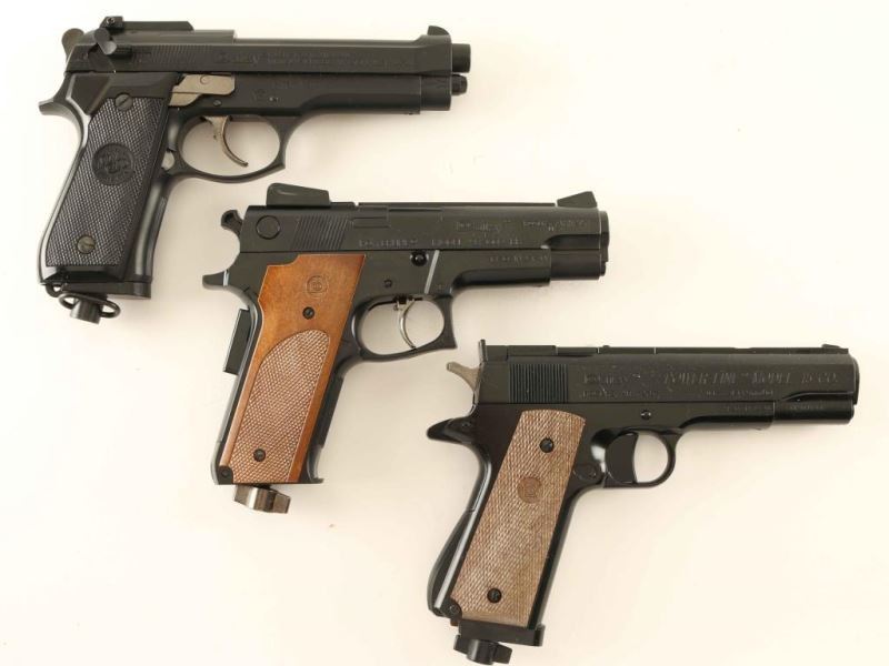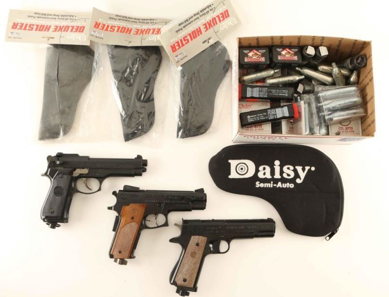 Including; Model 45 in plastic case with handle, .177 Ca. includes clips, Beretta 92 in plastic case-.177 Ca., Mdl 93 Super with clips in original box, 3 deluxe holsters, soft pistol case, 2 boxes of .177 Cal pellets, CO2 cartridges, BBs and more.