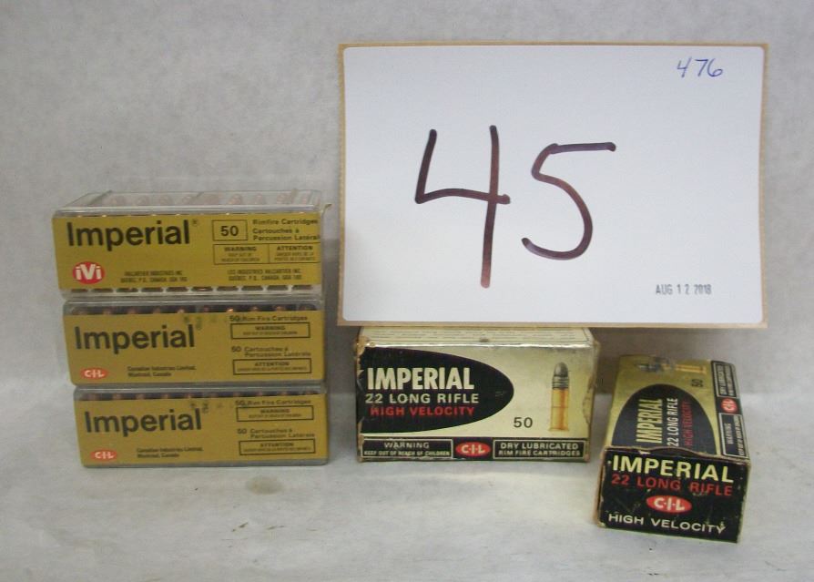 3 UNOPENED BOXES OF 50 IMPERIAL HOLLOW POINT 22 LR AMMO, 2 50 ROUND BOXES OF IMPERIAL SOLID POINT 22 LR.