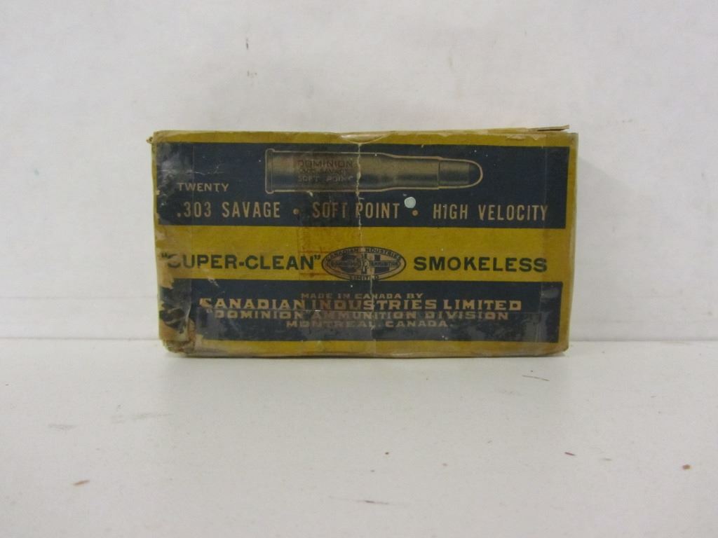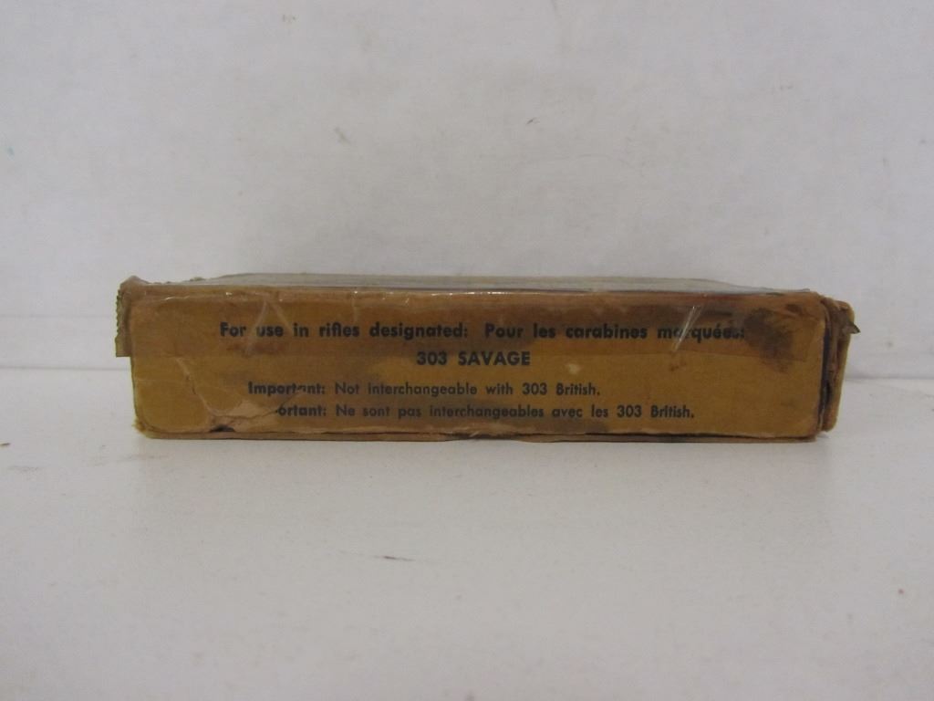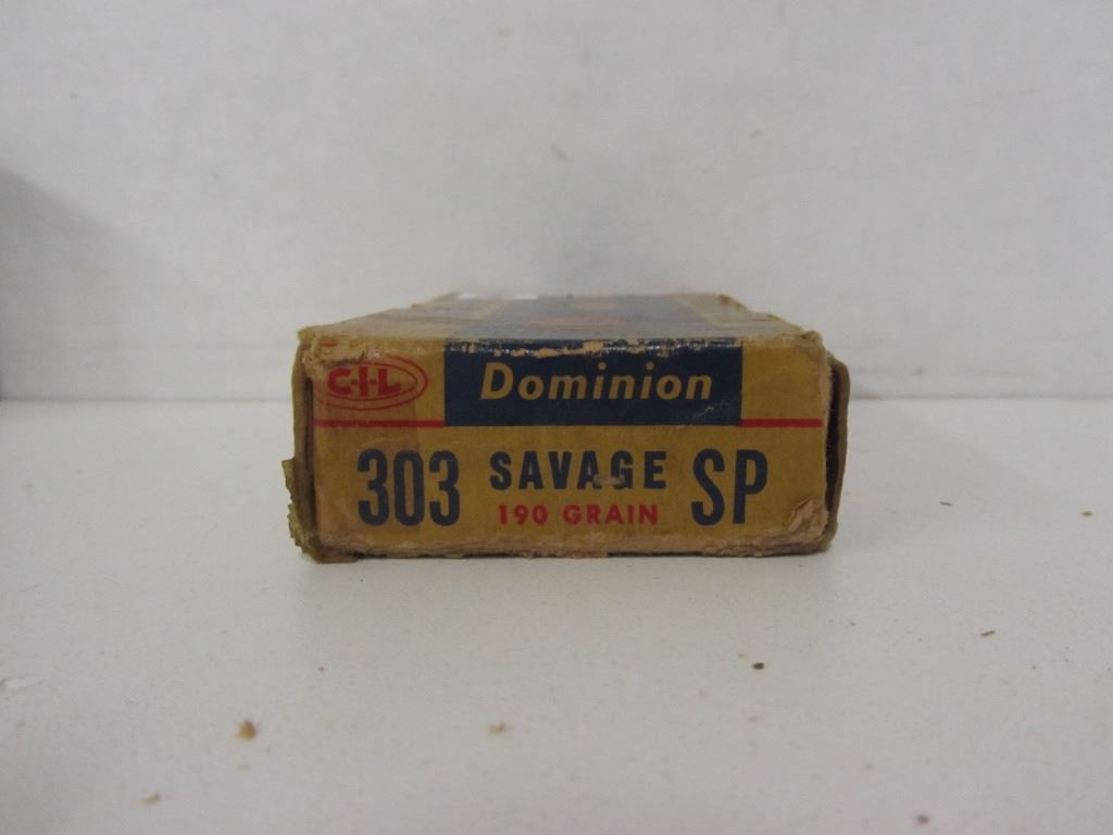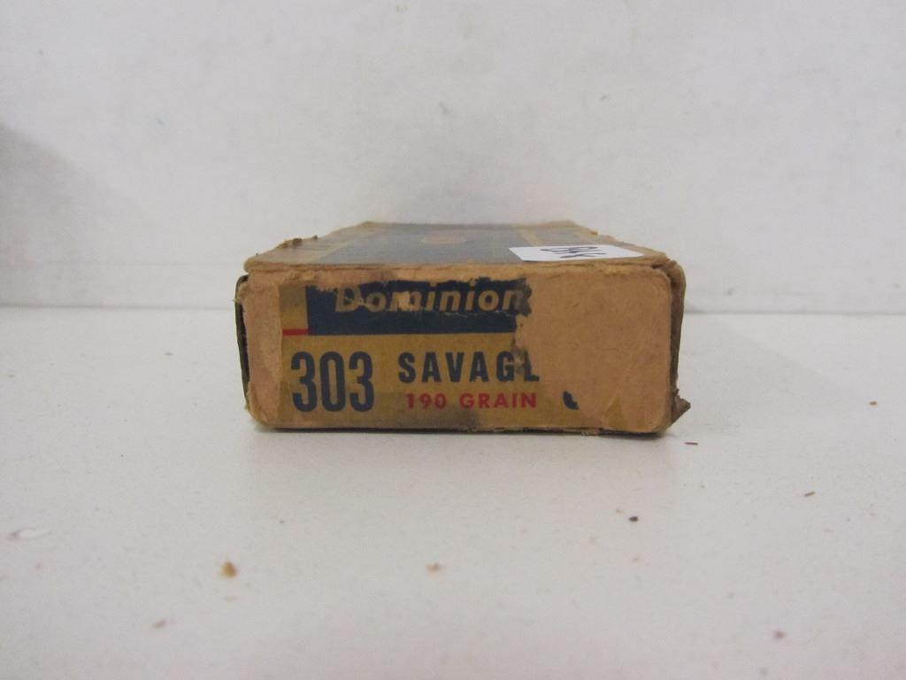 33 ROUNDS OF 303 SAVAGE. ONE 20 ROUND BOX OF C-I-L 303 SAVAGE 190GR SOFT POINT, ONE PART BOX OF C-I-L DOMINION 303 SAVAGE 190GR SOFT POINT HAS 12 SOFT POINT ROUNDS AND ONE FMJ ROUND AS WELL AS 7 BRASS CASINGS. BOTH BOXES HAVE BEEN TAPED, DOMINION BOX HAS DAMAGED BOTTOM TAB BUT IS STILL ATTACHED.