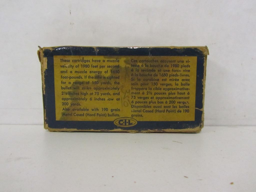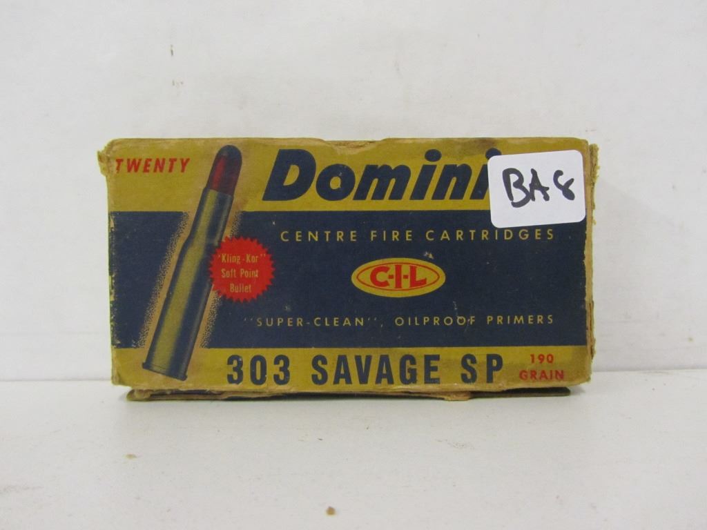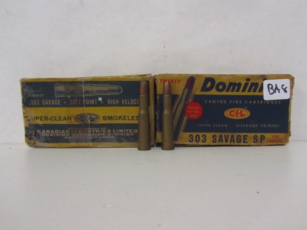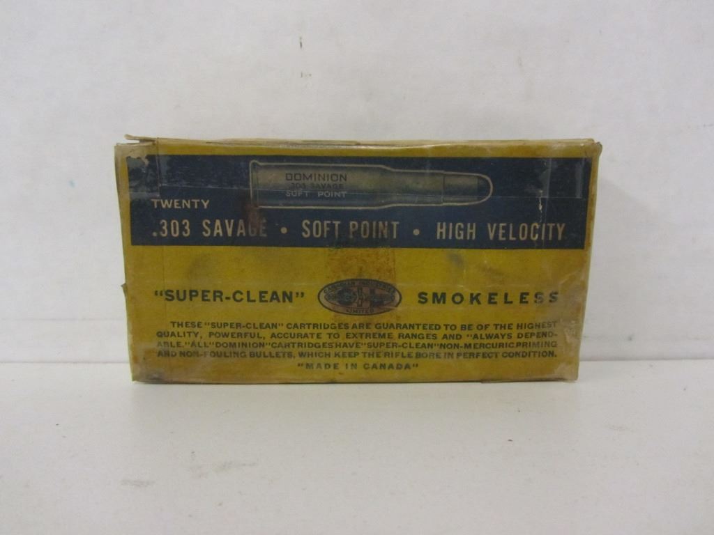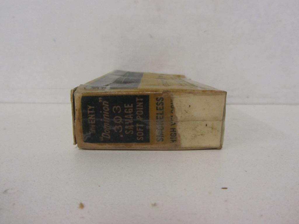 33 ROUNDS OF 303 SAVAGE. ONE 20 ROUND BOX OF C-I-L 303 SAVAGE 190GR SOFT POINT, ONE PART BOX OF C-I-L DOMINION 303 SAVAGE 190GR SOFT POINT HAS 12 SOFT POINT ROUNDS AND ONE FMJ ROUND AS WELL AS 7 BRASS CASINGS. BOTH BOXES HAVE BEEN TAPED, DOMINION BOX HAS DAMAGED BOTTOM TAB BUT IS STILL ATTACHED.