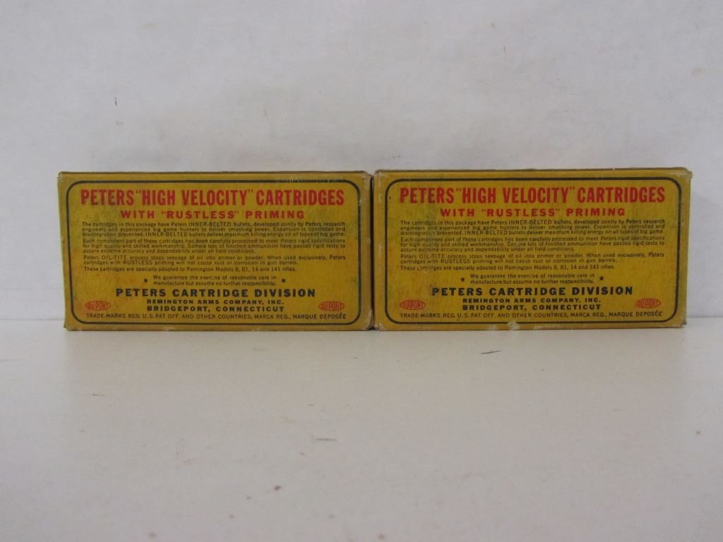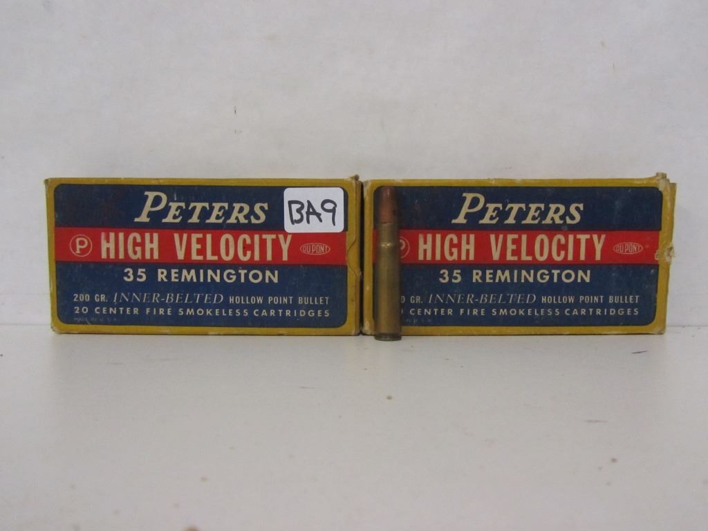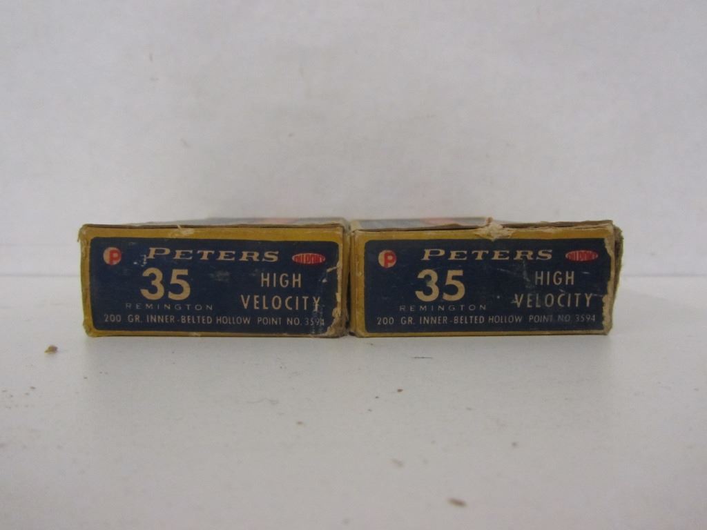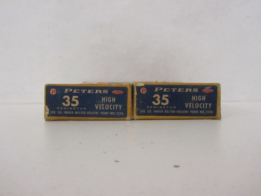 40 ROUNDS OF 35 REMINGTON 200GR INNER BELTED HOLLOW POINT AMMUNITION IN TWO PETERS HIGH VELOCITY BOXES. BOXES ARE IN GOOD OVERAL CONDITION.