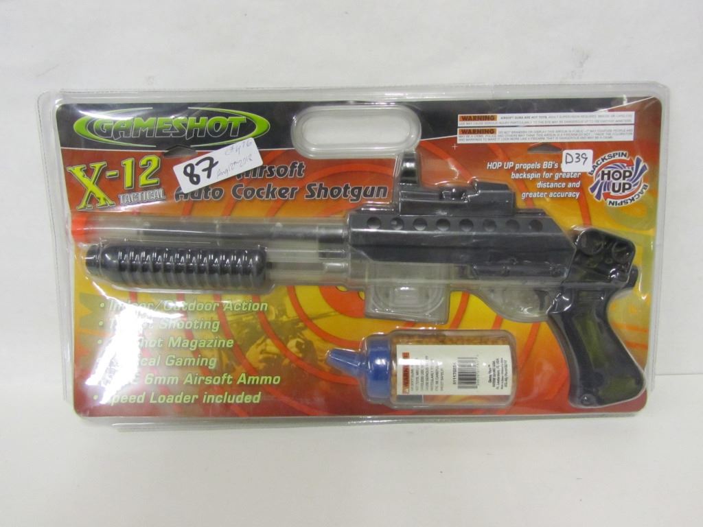 GAMESHOT X-12 TACTICAL AIRSOFT SHOTGUN. AUTOCOCKING MODEL WITH 15 SHOT MAGAZINE AND BOTTLE OF 2000 AIRSOFT BB'S. IN OPENED ORIGINAL PACKAGE