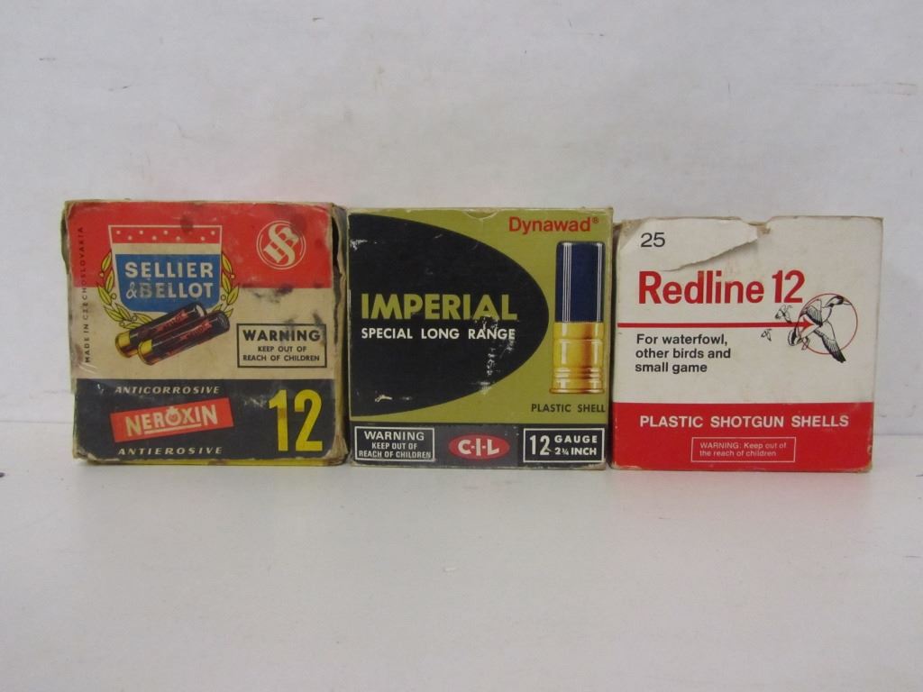 MIXED LOT OF 12GA 2 3/4" SHOT SHELLS, ONE BOX OF SELLIER & BELLOT 2 1/2" SHOT SHELLS WITH 23 SHELLS, ONE BOX OF IMPERIAL SPECIAL LONG RANGE 12GA 2 3/4" WITH 17 SHELLS, ONE BOX OF REDLINE 12 GA 2 3/4" WITH 20 ASSORTED SHOT SHELLS INSIDE.