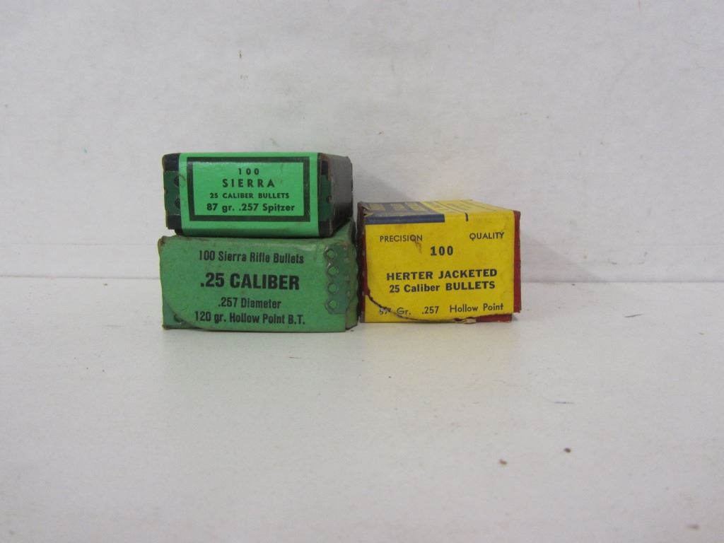 ONE BOX OF SIERRA 25CAL 87GR SPITZER BULLETS LABELLED 100 PIECES, ONE BOX OF SIERRA 25CAL 120GR HOLLOW POINT B.T. BULLETS LABELLED 100 PIECES, ONE BOX OF HERTER JACKETED 25CAL 57GR HOLLOW POINT BULLETS LABELLED 100 PIECES.