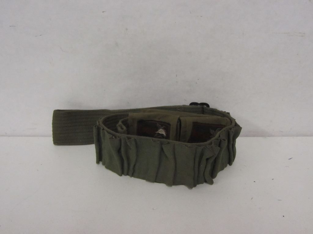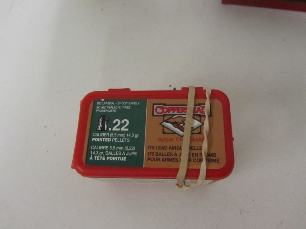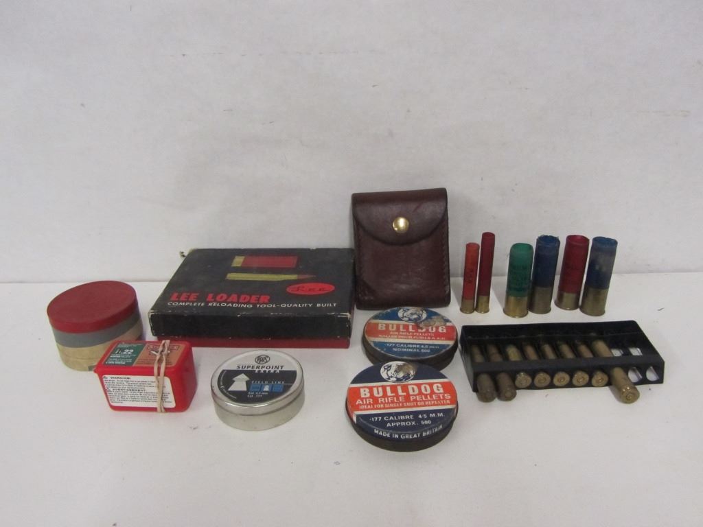 TIN OF SHOTGUN PRIMERS, TWO TINS OF BULLDOG .177CAL PELLETS, ONE TIN OF RWS SUPERPOINT .177CAL PELLETS, ONE BO OF COPPERHEAD .22CAL PELLETS, ONE LEE LOADER DIE SET (UNMARKED CAL/GA), FOUR 12GA SPENT SHELLS, TWO 410GA SPENT SHELLS, ONE FOLDING LEATHER AMMO WALLET, TWO ROUNDS OF 308 WIN, ONE ROUND OF 45 COLT, FOUR 30-30WIN BRASS, ONE 300 WEATHERBY MAG BRASS.ONE AMMO BELT.