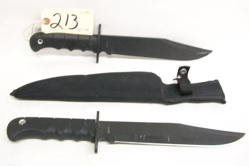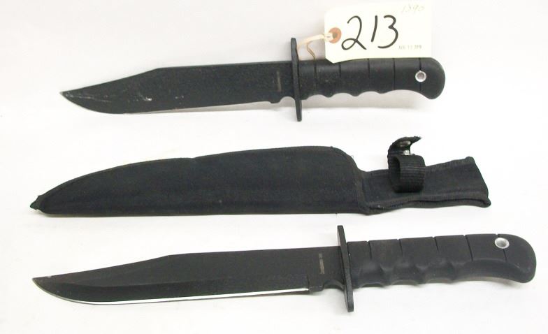 TWO LARGE CANADA AMMO KNIVES, 8 1/2" BLADE, RUBBER HANDLES, ONE HAS A NYLON SHEATH AND ONE HAS NO SHEATH