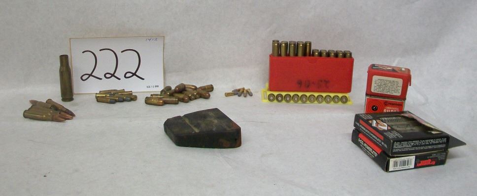ONE SHORT 50 CAL EMPTY CASE, 5 INERT 30-30 WIN CARTRIDGES, 8 RDS .32 COLT REVOLVER, 13 RDS .45 ACP FMJ, 5 RDS .22LR 2 PACKS .22 CAL PELLETS, 8 CO2 CYLINDERS, 9 RDS 25-06 RELOADS, 10 EMPTY CASES 25-06, ALL MADE FROM 30-06, LEE ENFIELD NO 4 MK1 MAG FULL OF CORROSION, 10 EMPTY 243 WIN CASES.