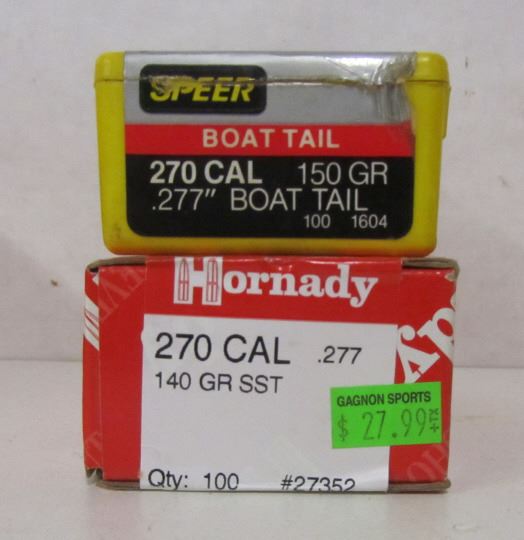 ONE 110 PIECE BOX OF HORNADY 270CAL 140GR SST BULLETS, ONE PART BOX OF SPEER 270CAL 150GR BOAT TAIL BULLETS WITH 51 PIECES INSIDE.
