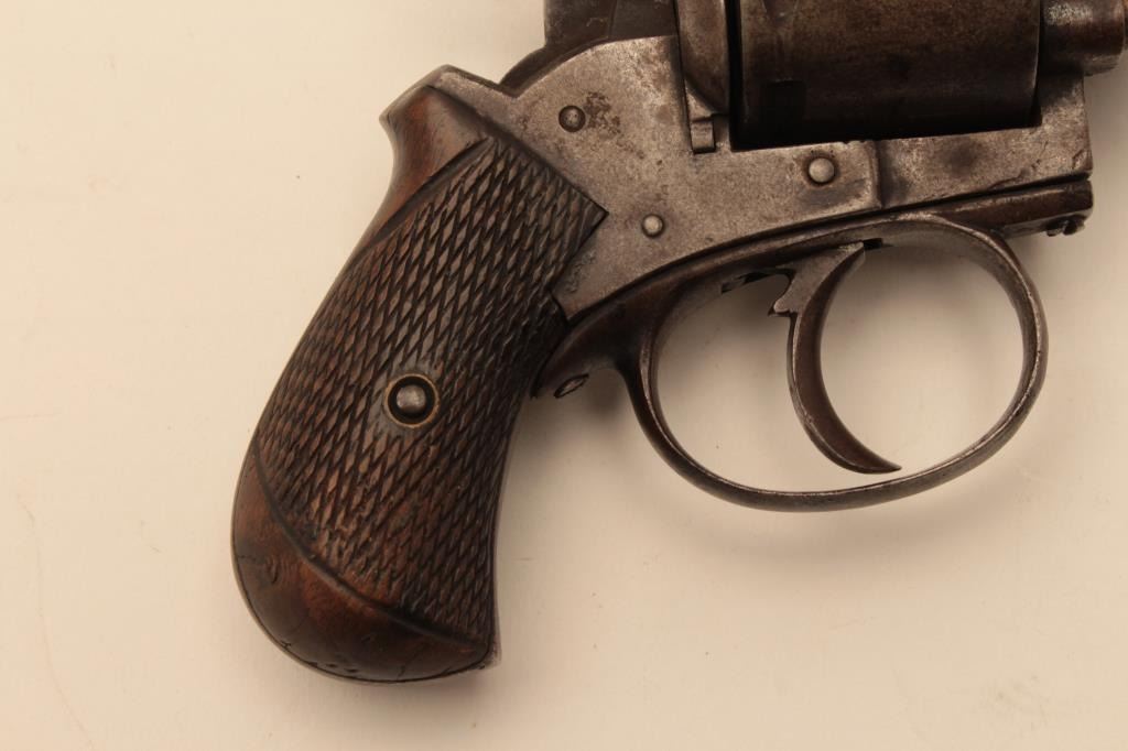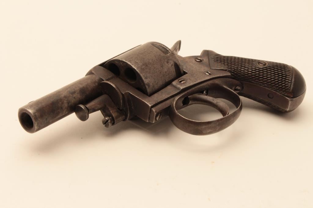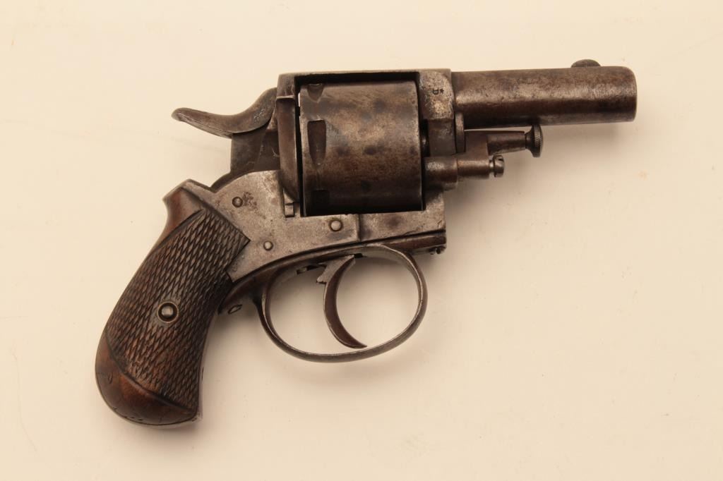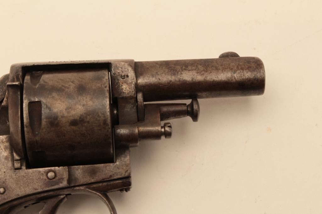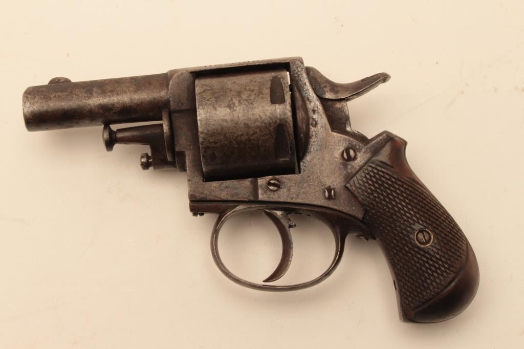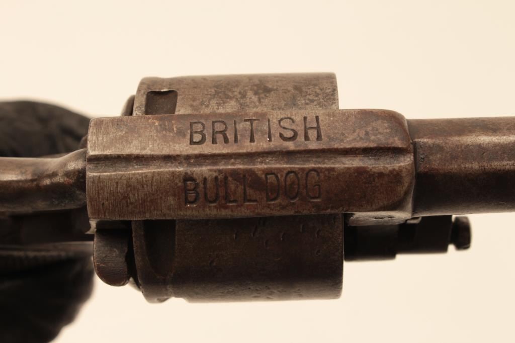 Antique .32 caliber six shot double action revolver marked “British Bulldog” on the frame. Belgium proofs circa 1879-1890s. Measures 6 ½” overall with a 2 ¼” barrel. Brown patina finish and checkered wood grips. Action not working. (Antique) Est:$200-400