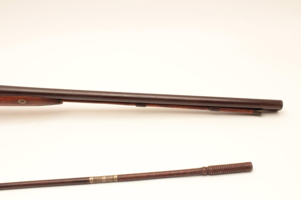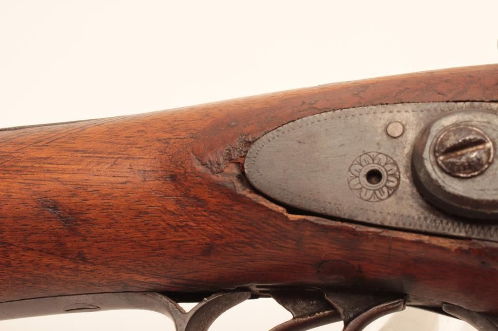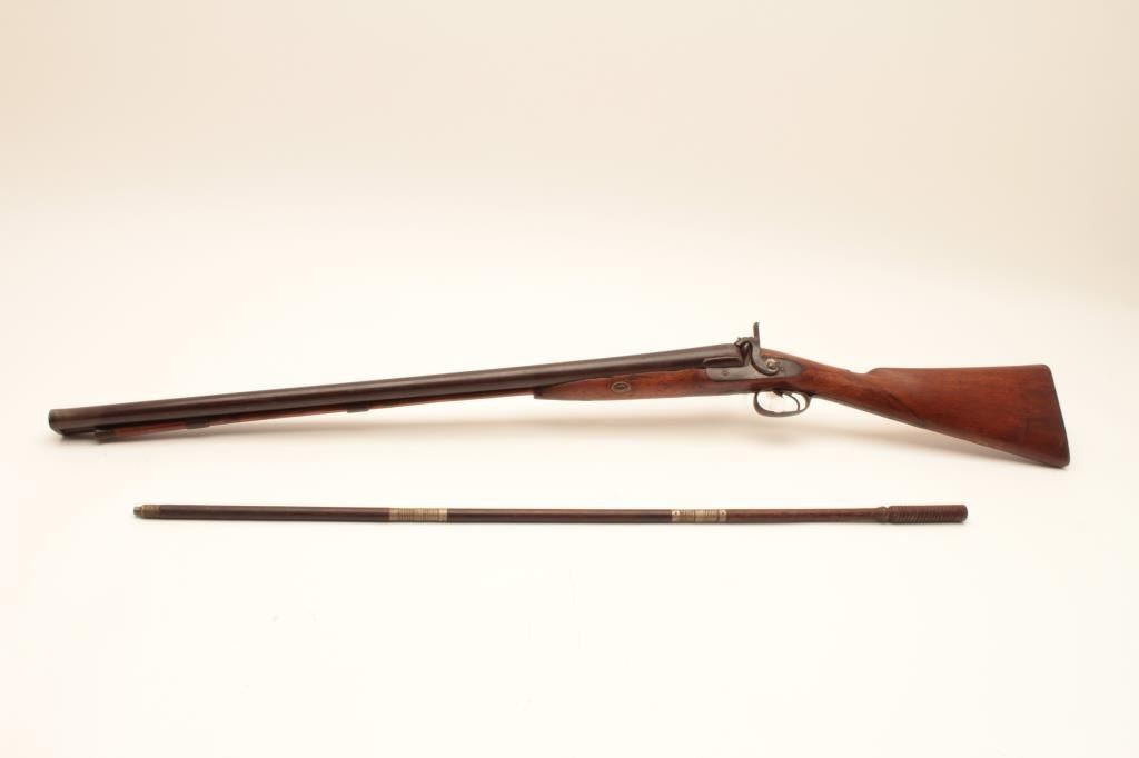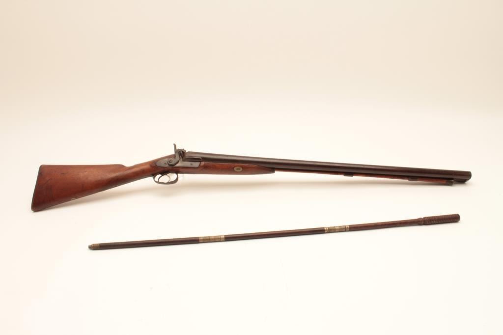 Thomas King London laminated steel marked SxS 8GA percussion shotgun with 31 ½” barrels, and measures 47 ½” overall. Working but half cock safety not holding. Good overall with minor aging. Period ramrod and cleaning rodretained. (Antique) Est.: $250-$500