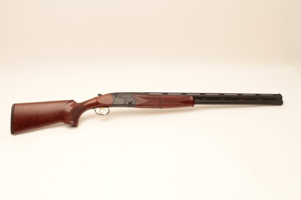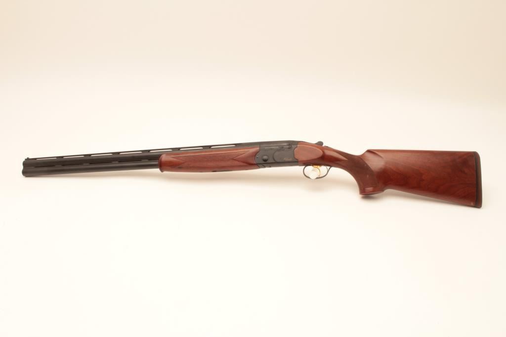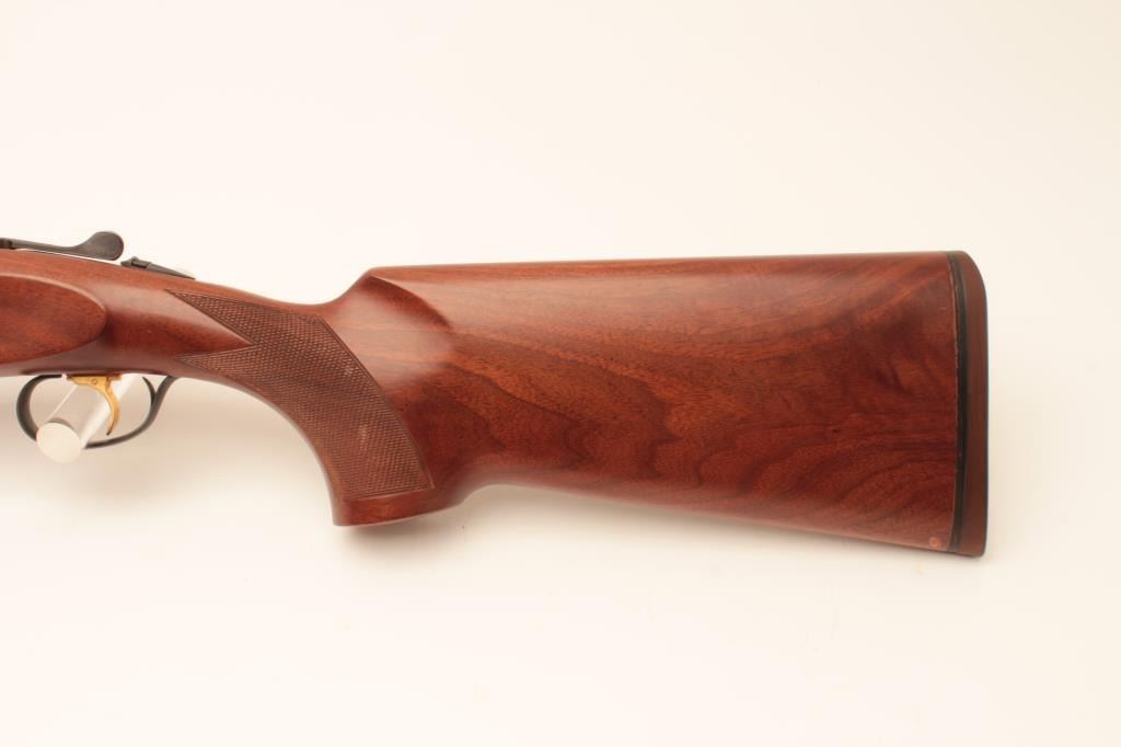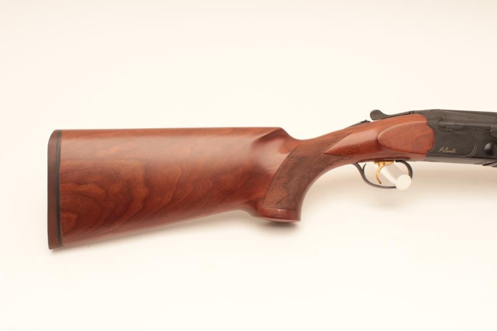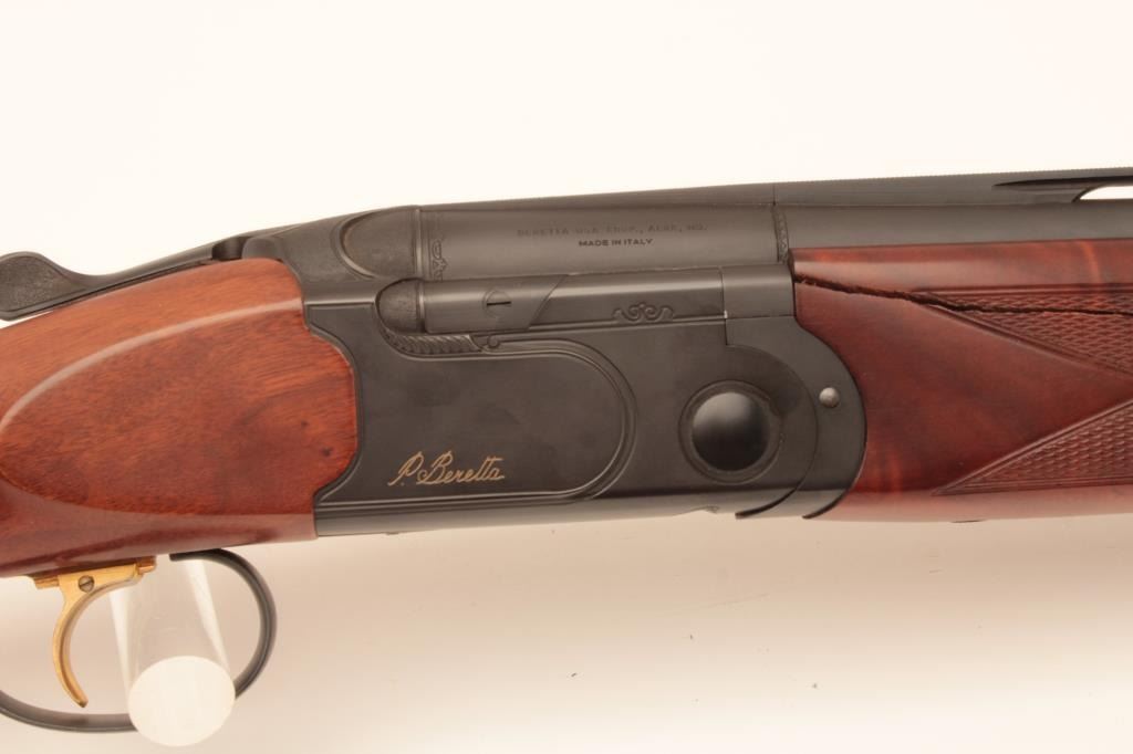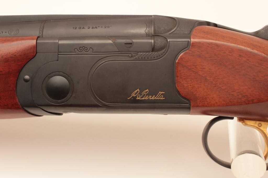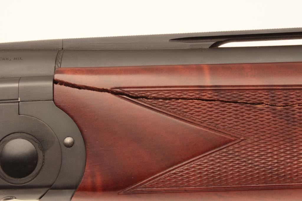 Beretta Model 682 Super Sport 12 gauge Over Under Shotgun. Serial #F327848. 28” barrels (split) with low rise vent rib, single trigger auto ejector, one set screw in chokes. Thin line recoil pad 14 ¾” pull.Metal is 98%-99% with minor use showing. Forend shows large compression crack on the right side that needs repair. Est: $500-$1,000