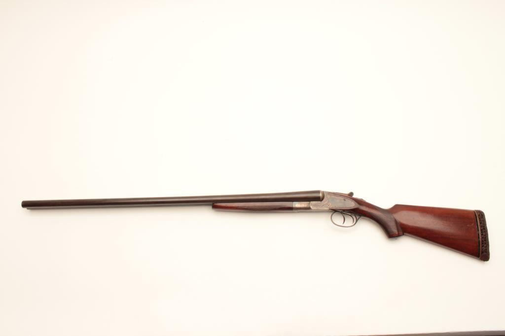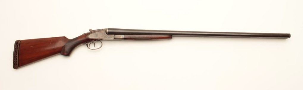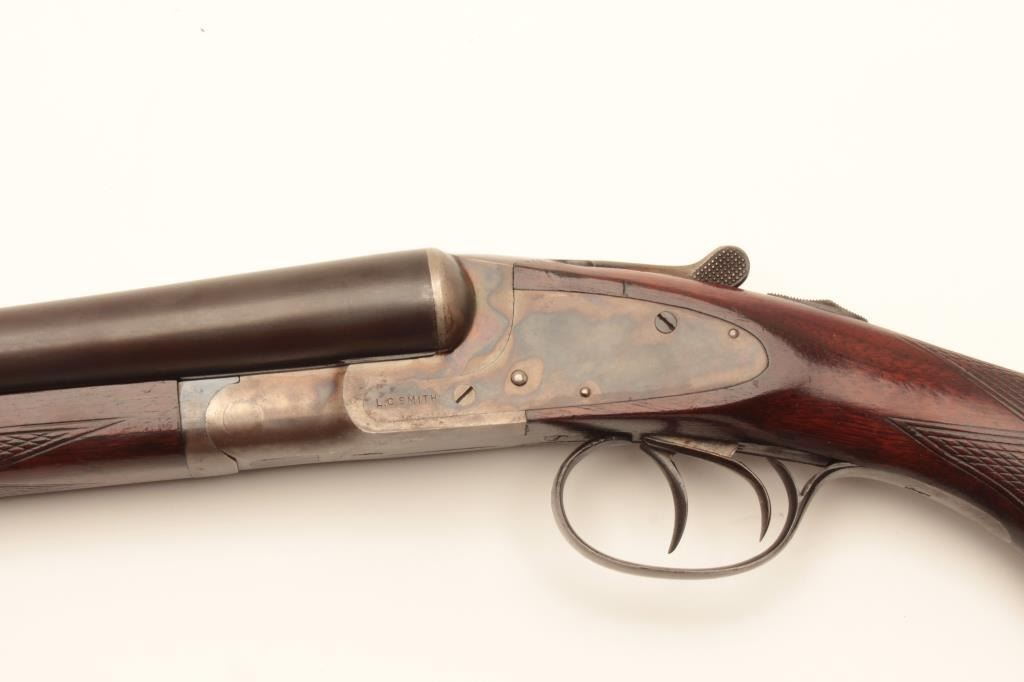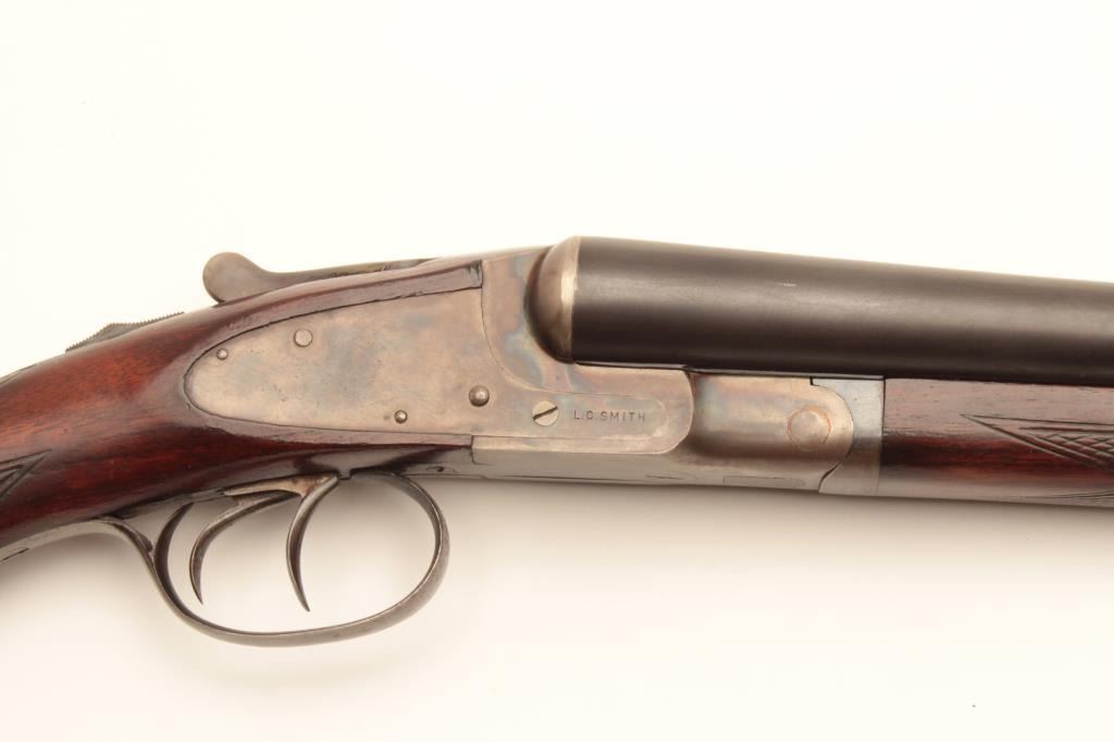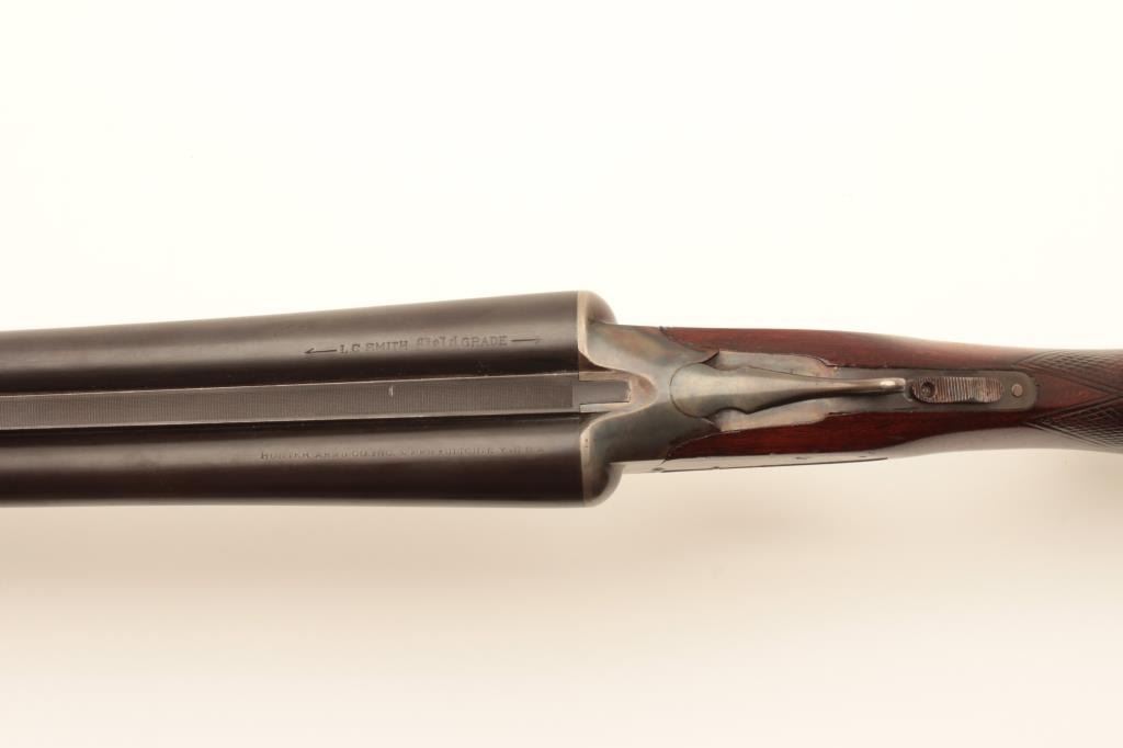 L.C. Smith 12 GA Field Grade SxS Shotgun w/ 30;1/8inch BBL #202395 MFG by Hunter Arms Company. Choked full and full. Double triggers and standard extractors. 90-95% Blue and case colors with RT BBL showing smallding 12; 1/8 inch from beech (Does not show through in bore) our consigner never noticed it otherwise bright bores, locks tight, very good wood with straining and normal signs of use. 14” to end of rubber pad (needsreplacement) A very nice L.C. that needs ding removed and fresh recoil pad to improve significancy Est:$350-700