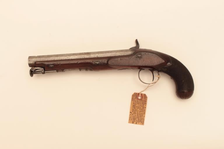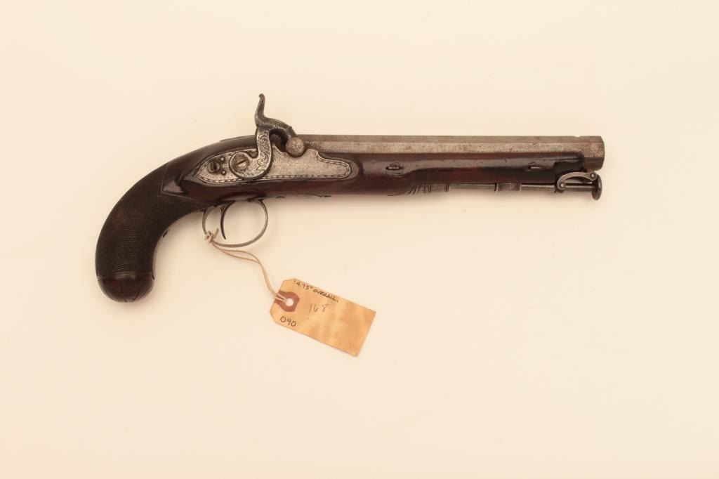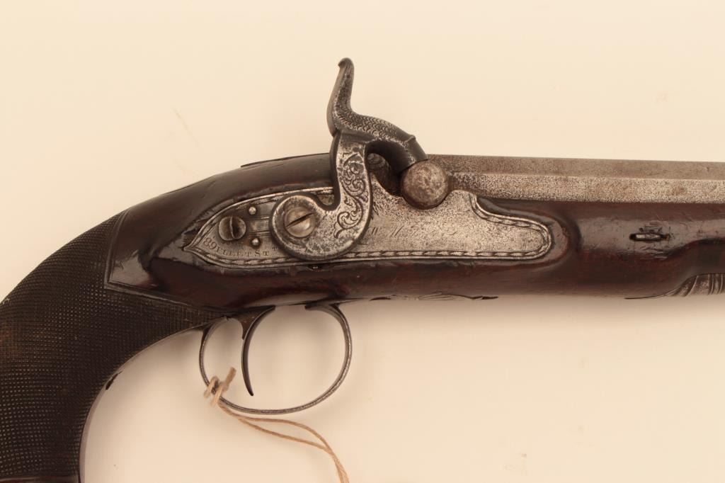 H.W. Mortimer Officers style pistol circa 1790 converted from Flintlock to percussion about 1830-40s. Mortimer was a royal gunmaker and BBL and lock carries his full signature alone with (Maker to his Majesty) approx. 64caliber smooth w/captured ramrod and 7/8 stocked to muzzle w/scattered light erosion and pin prick pitting . Good wood and good overall condition. 15” overall w/9”BBL. Est:$600-1200