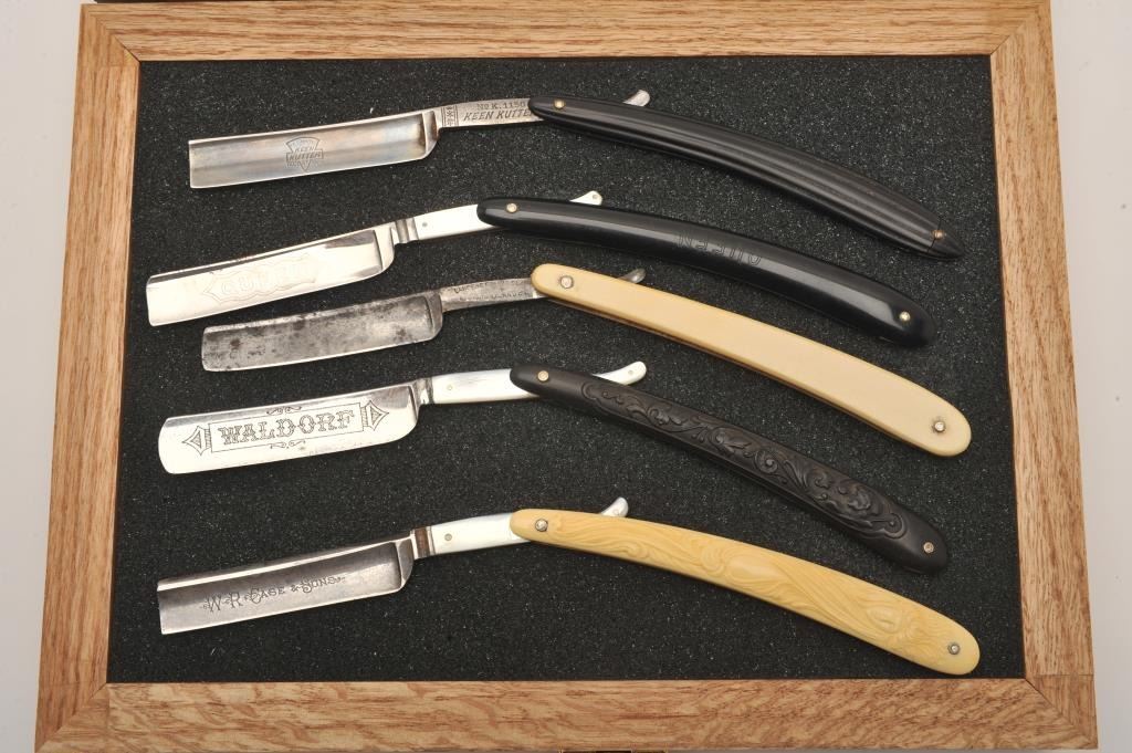 Collection of 5 vintage Strait Razors in display case, keen cutter, queen landers early + Clark, Waldorf brand by Boker, W.R. case + sons cellulite grips 3 with pearl very nice condition and collectors quality values up to 200 each. Est:$300-600
