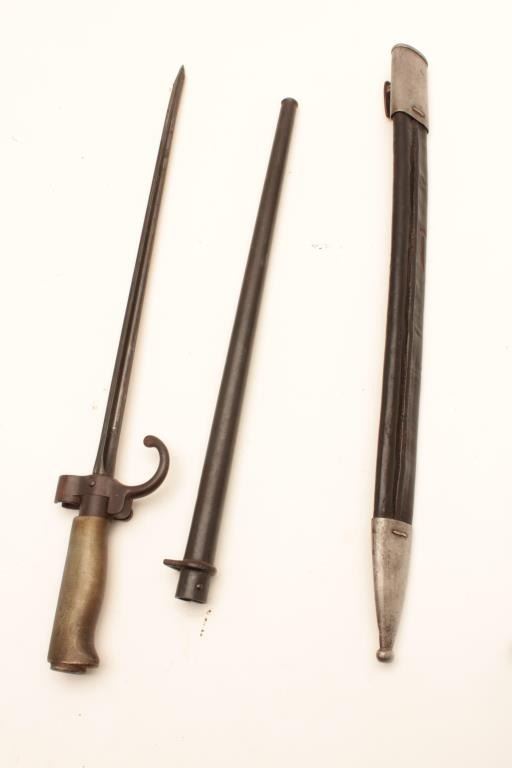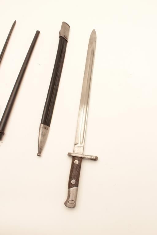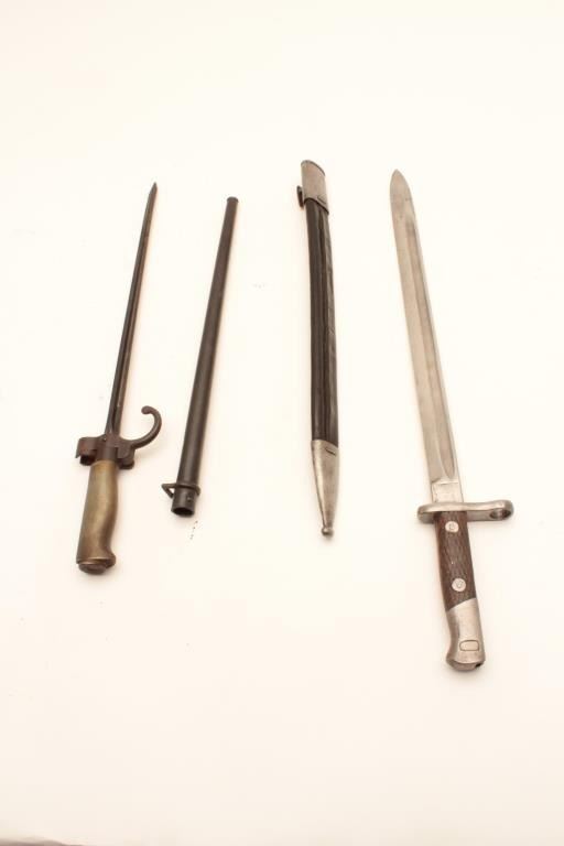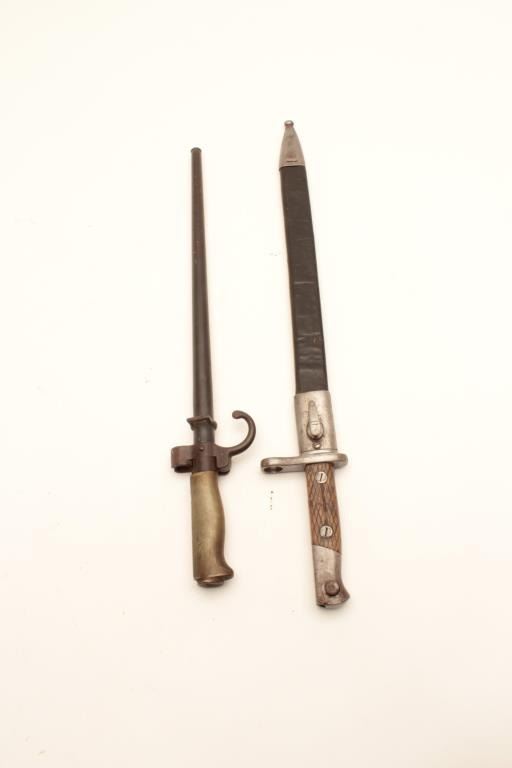 LOT OF 3 1- French Needle Bayonet with scabbard in good to very good condition. WW1 era for Lebel etc. 2- Spanish Bayonet marked Artilleria/etc/with scabbard in good condition 3- 44 dated bayonet for Hungarian Mauser in good condition Est:$150-300