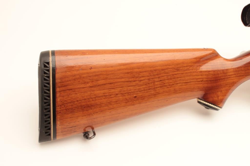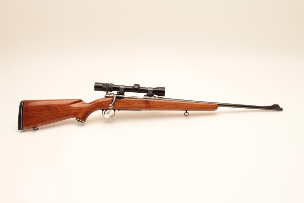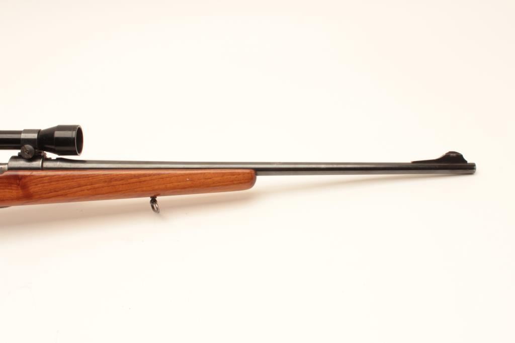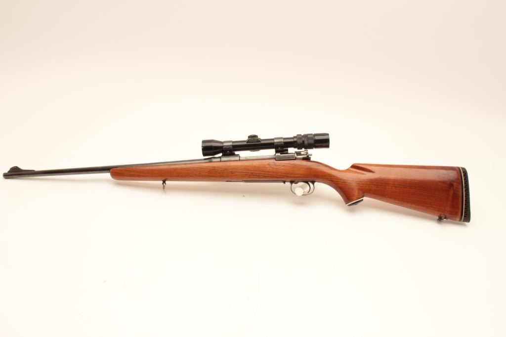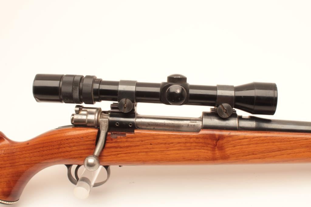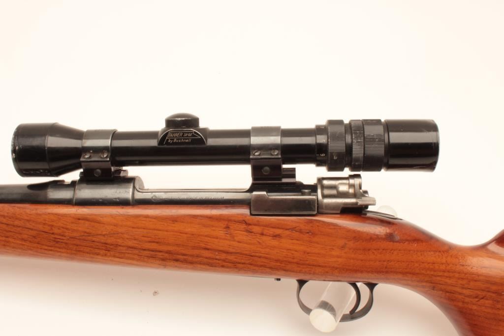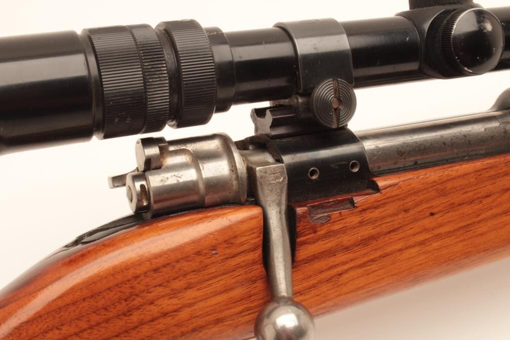 Sporterized FN Belgian 98 action with .270 caliber J.C. Higgins Model 50 barrel, blued finish, tap holes in action, scoped 3x9 Banner with good optics; about good overall with good stock and added hard rubber buttpad; no visible S/N. (C&R). Est.: $300-$600.
