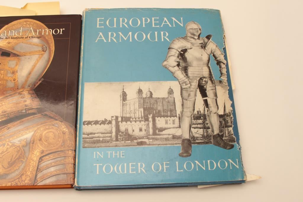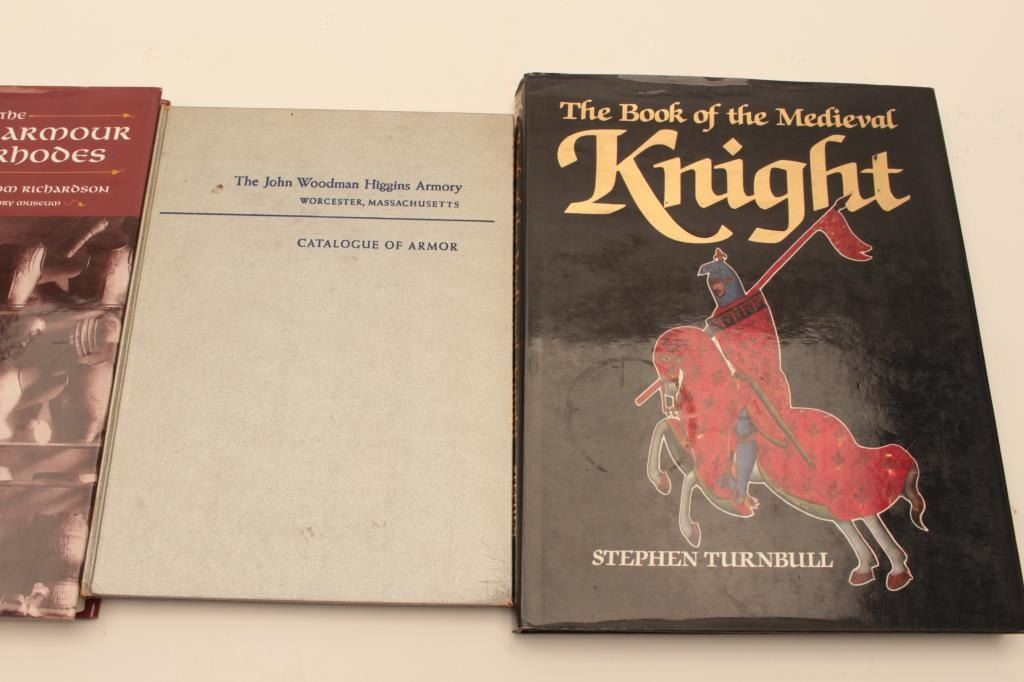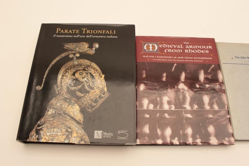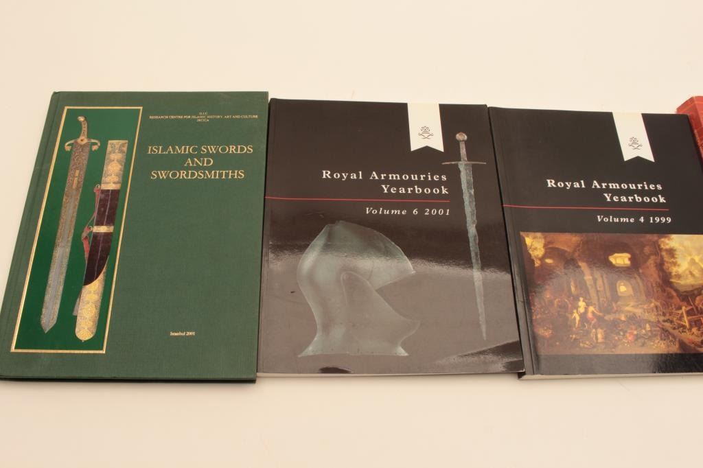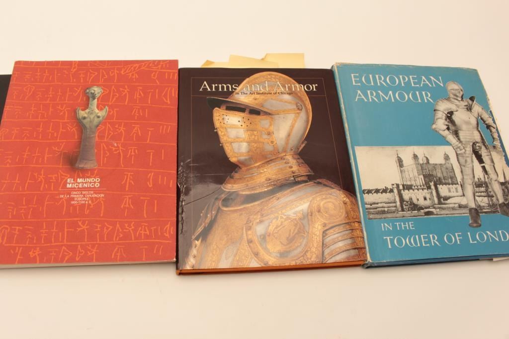 BOOK LOT 1- Royal Armouries Yearbook volume 4 and 6 2- Islamic swordsz and swordsmiths 3- European Armor “In the tower of London” 4- Arms and Armor “ In the art of instituteof Chicago” 5- El Mundo Micenico 6- Parate Trionfali 7- The Medieval armor from Rhodes 8- The book of the medieval knight by Stephen Turnbill 9- The John Woodman Higgins Armory “Catalogue of Armor” Est:$250-500
