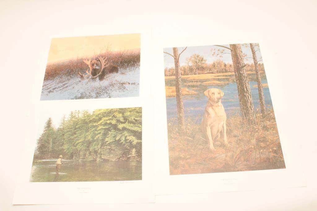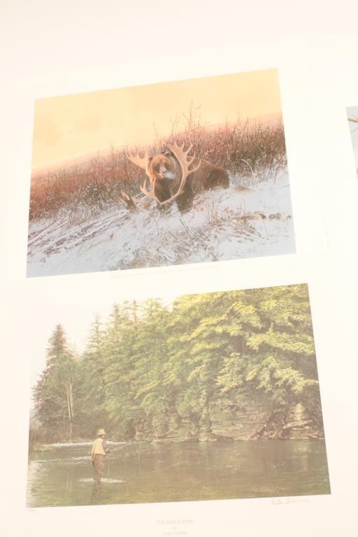 Lot of 3 color prints, one a limited edition (17/400) and hand sighed by Peter Corbin entitled “The Ledge Pool” showing a fly fisherman, approximately 18” x 22”; one showing a grizzly bear by Michael Coleman,approximately 19” x 22” and one limited edition (796/800) and hand signed by William Gillies entitled “The Professional” showing a hunting dog next to a marsh. Great for the sportsman’s den or office when framed.Est.: $150-$300.