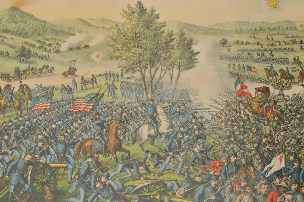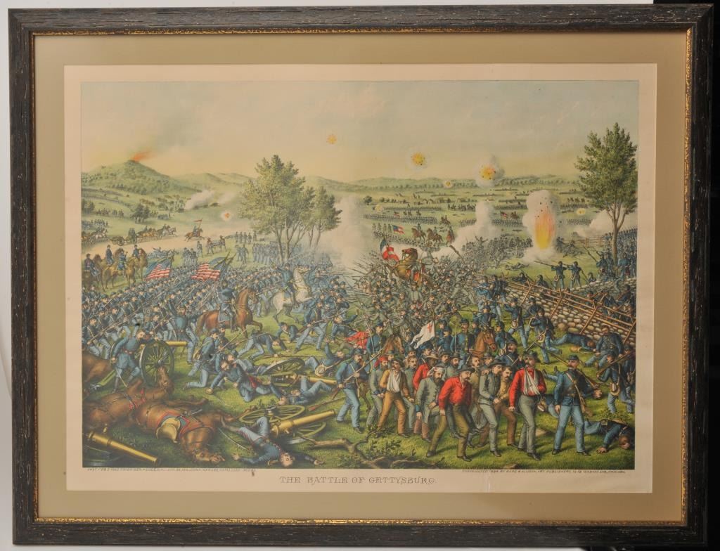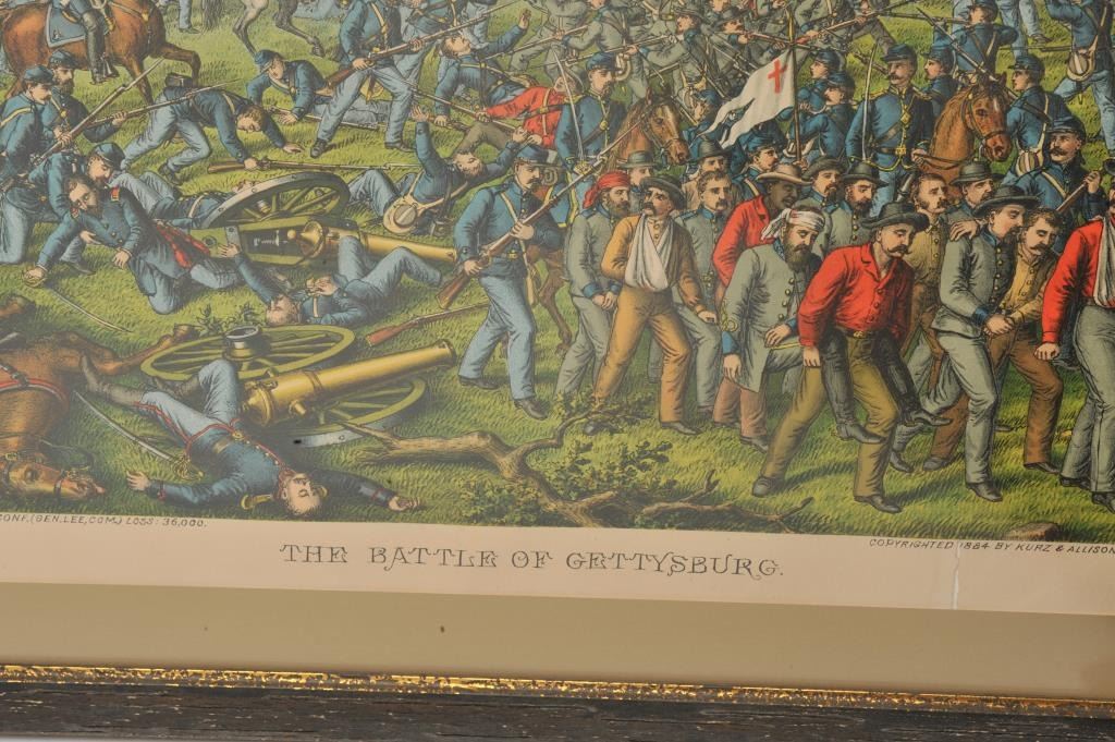 Framed and matted color print entitled “The Battle of Gettysburg”; approximately 25” x 32” overall; shows copyright 1884 marking in lower right hand corner; unknown age but well accomplished. Est.: $25-50