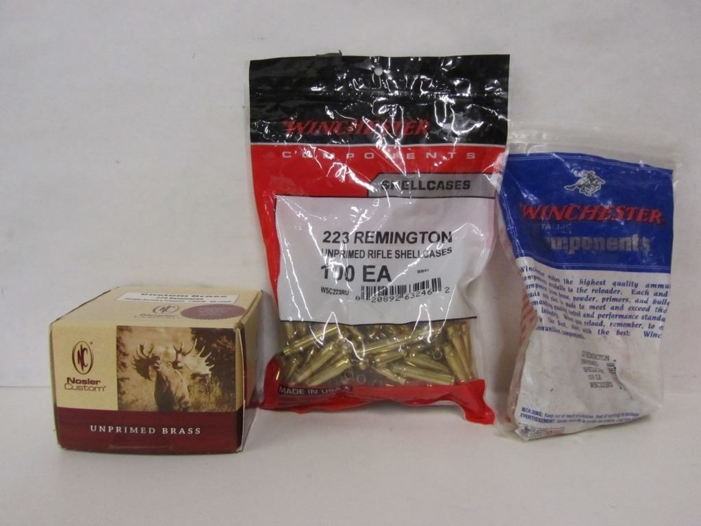 44 PIECES OF NOSLER CUSTOM UNPRIMED 223 BRASS, 126 PIECES OF WINCHESTER UNPRIMED 223 BRASS