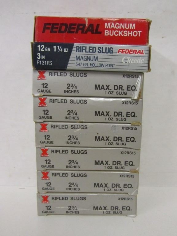 SIX 5 SHELL BOXES OF WINCHESTER SUPER-X 12GA 2 3/4" 1OZ RIFLED SLUGS, ONE BOX OF FEDERAL 12GA 2 3/4" MAGNUM 00 BUCKSHOT WITH 4 SHELLS INSIDE, ONE BOX OF FEDERAL CLASSIC 12GA 3" MAGNUM RIFLED HOLLOW POINT SLUGS.