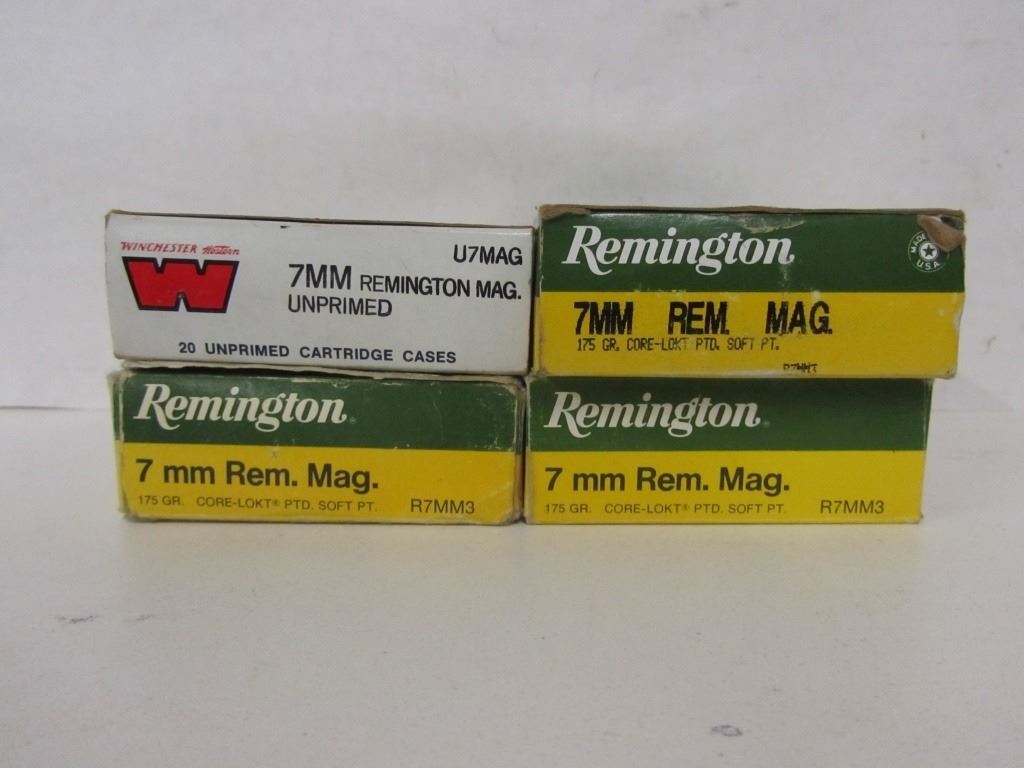 ONE BOX OF REMINGTON 7MM REM MAG 175GR CORE-LOKT SOFT POINT WITH 12 LIVE ROUNDS AND 8 PIECES OF BRASS, ONE BOX OF REMINGTON 7MM REM MAG WITH 14 PIECES OF UNPRIMED BRASS, ONE BOX OF REMINGTON 7MM REM MAG WITH 20 PIECES OF UNPRIMED BRASS, ONEEMPTY WINCHESTER 7MM REM MAG UNPRIMED BRASS BOX.