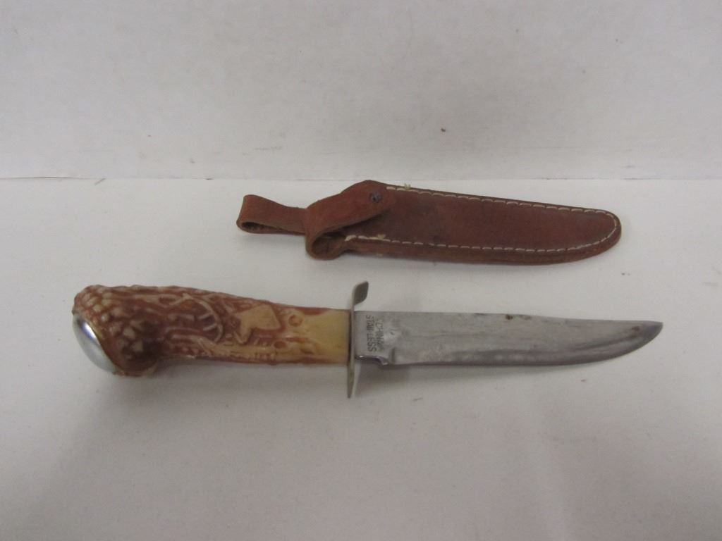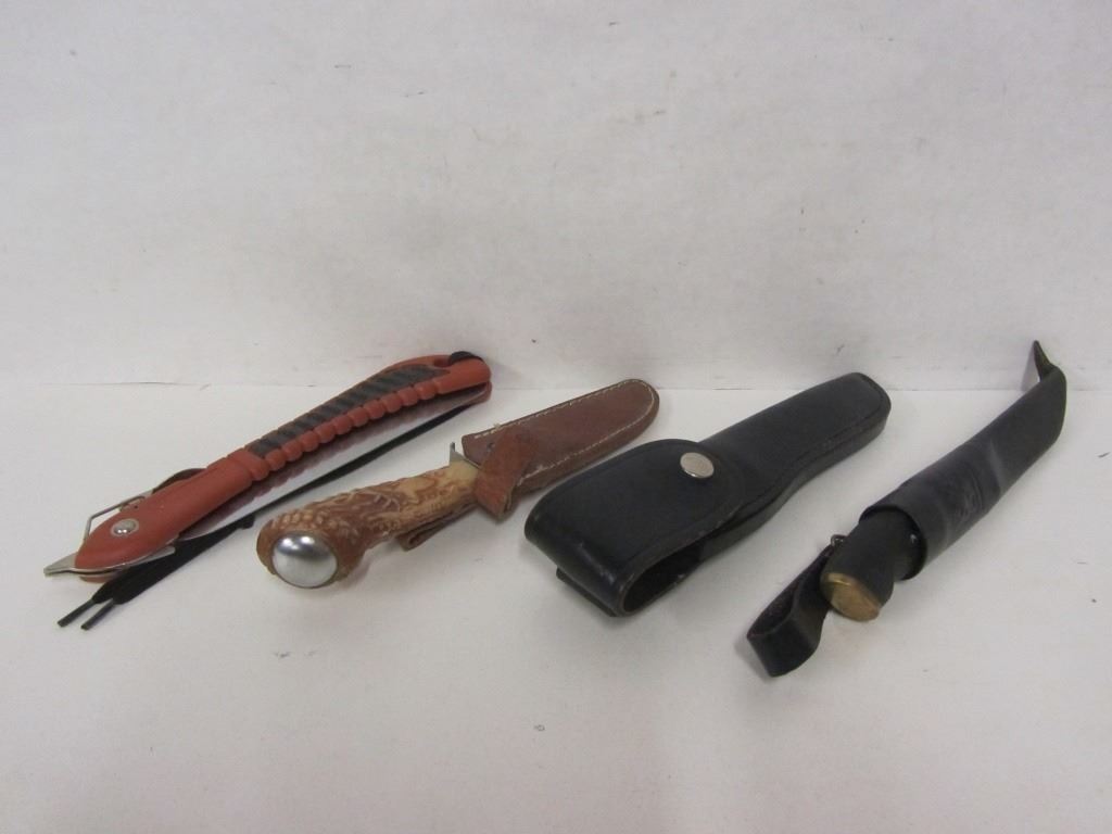 Lot 130 THREE SKINNING KNIVES AND ONE FOLDING SAW