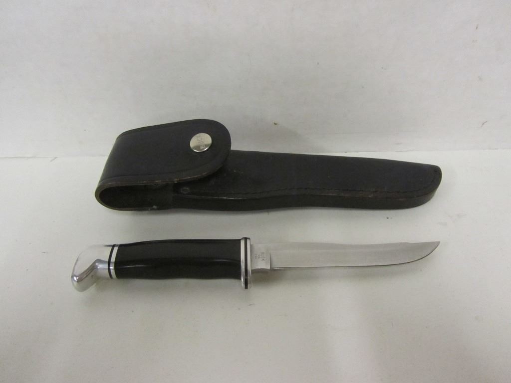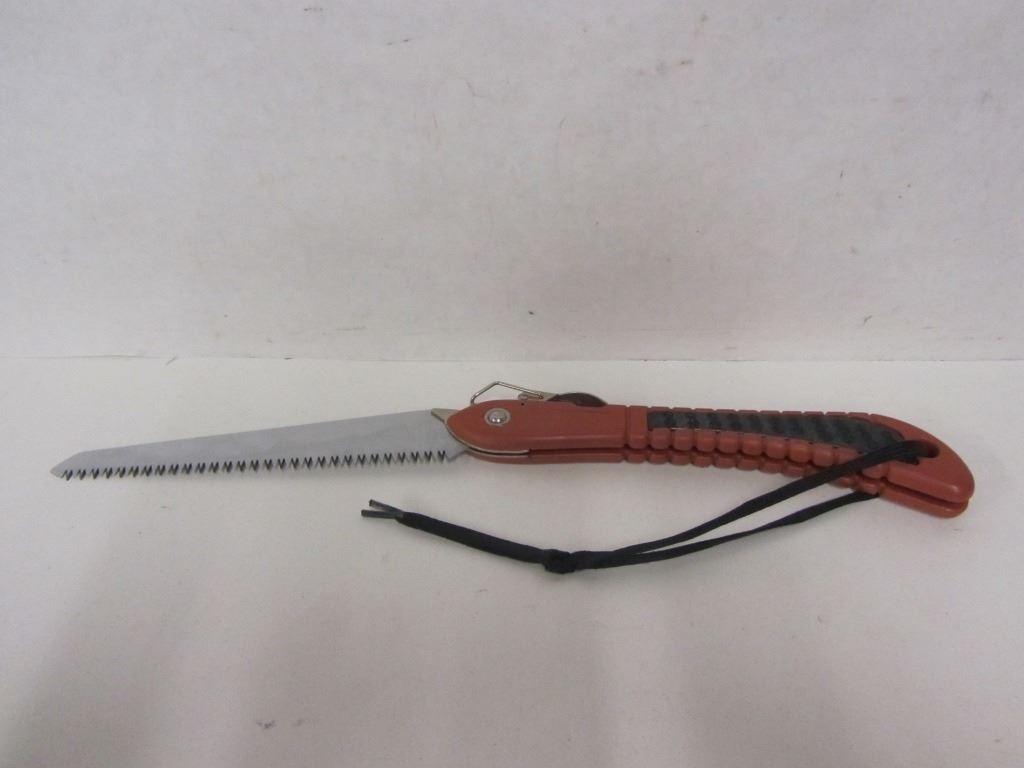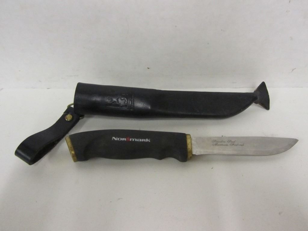 ONE BUCK SKINNING KNIFE, ONE UNBRANDED SKINNING KNIFE WITH CHINESE STEEL BLADE, ONE NORMARK SKINNING KNIFE WITH MARTTIINI FINNISH STEEL BLADE, ONE RAINBOW FOLDING SAW.