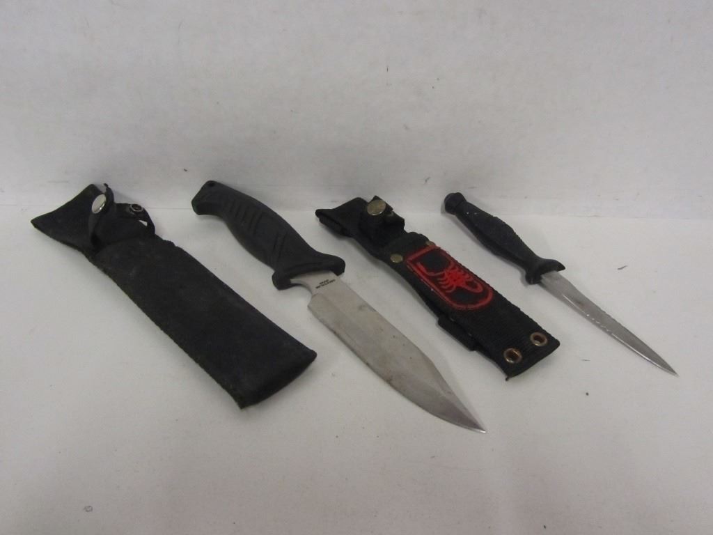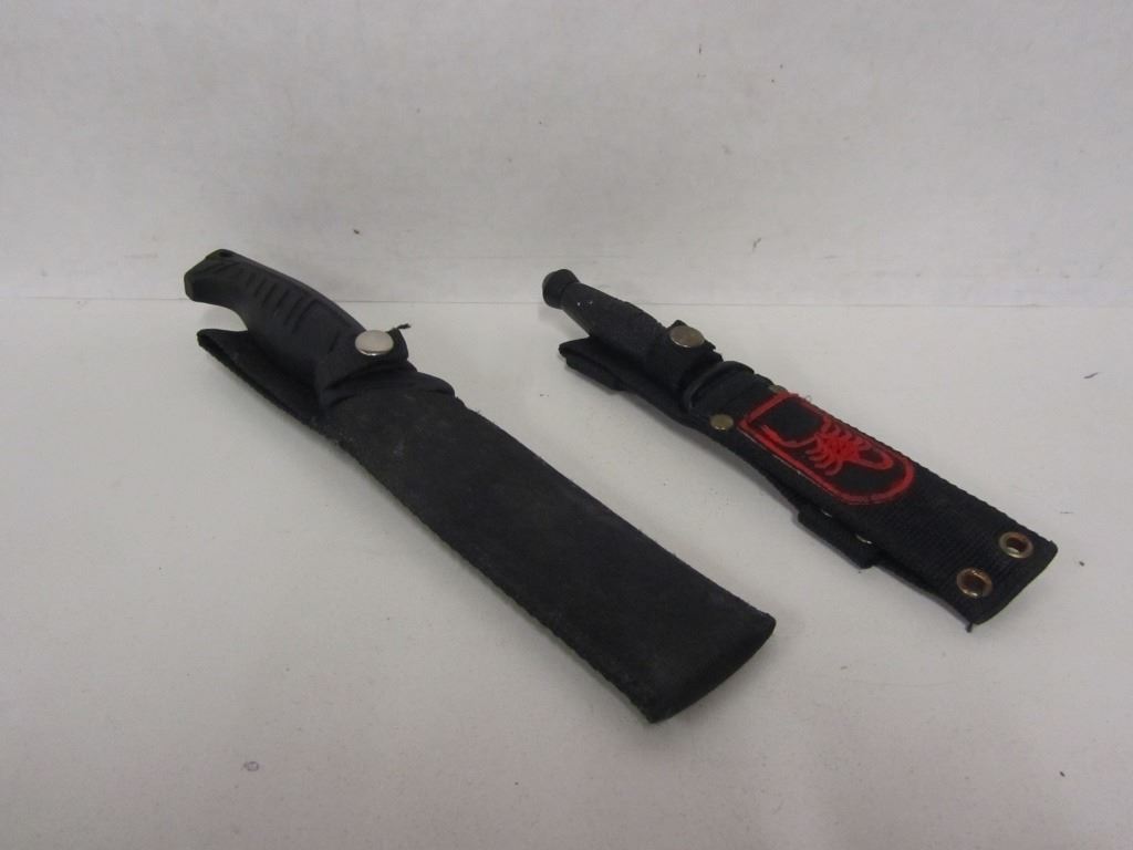 ONE KNIFE WITH LINEN SHEETH, RUBBER GRIP AND A 440 STAINLES STELL BLADE ONE KNIFE WITH KEVLAR SHEETH AND SCORPION EMBOSSMENT ON SHEETH AND HILT