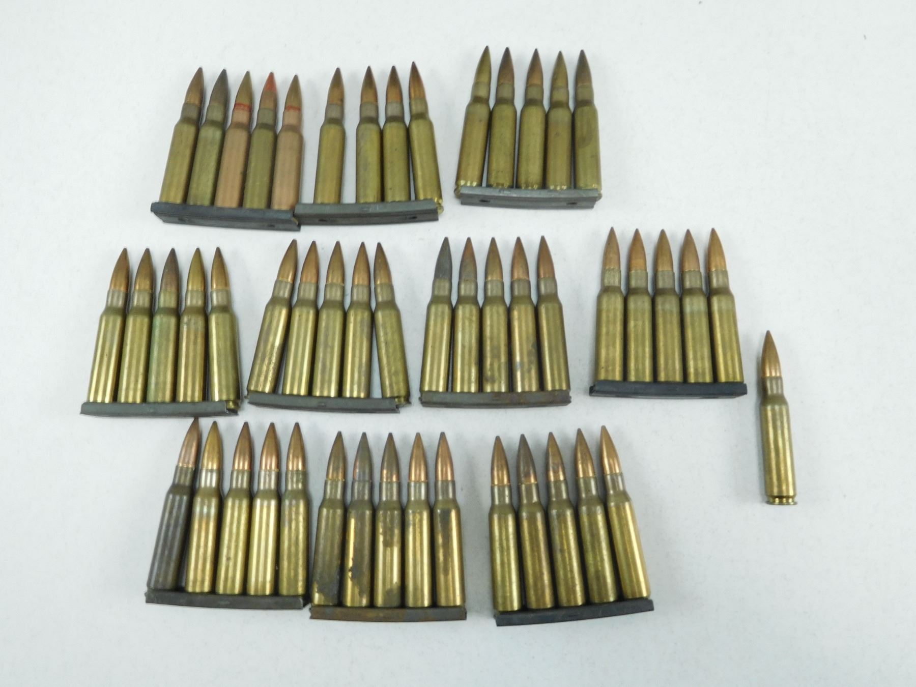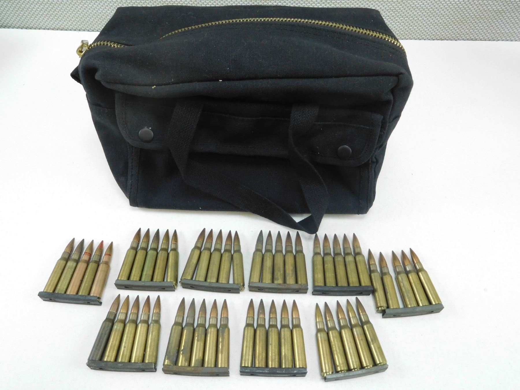 ASSORTED 7.62MM AMMO , 50 RNDS ON STRIPEPR CLIPS WITH AMMO BAG