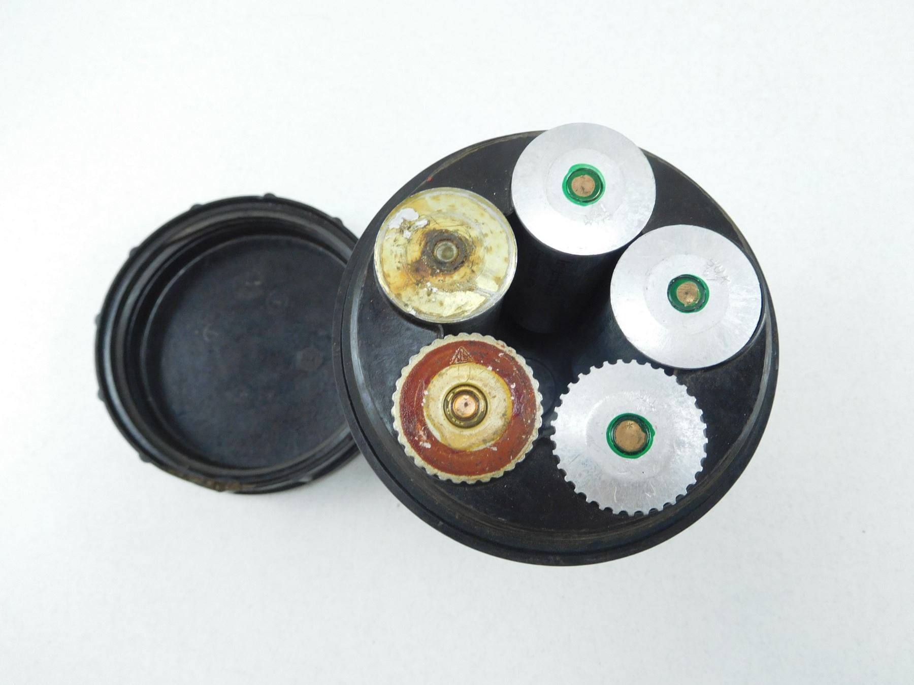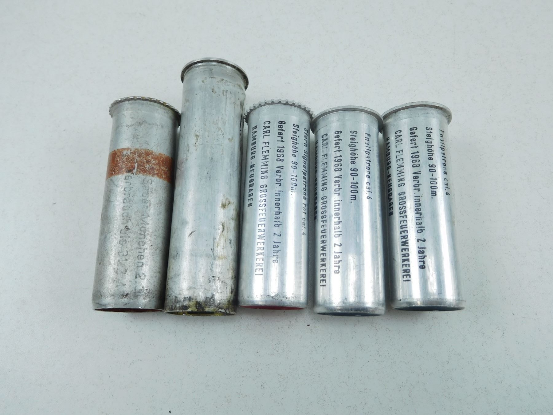 GERMAN FLARE GUN AMMUNITION CASE & FLASRES , 4 RNDS 1 CASE, IN BAKELITE CASE MARKED 1941