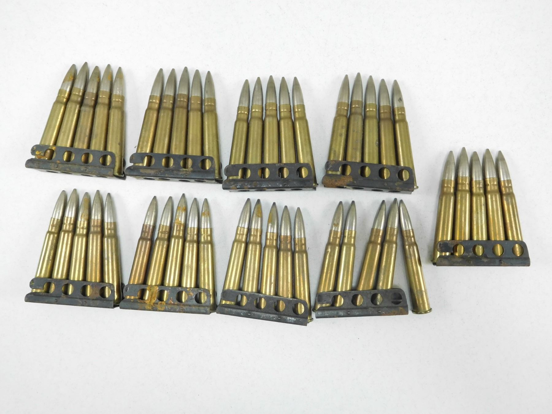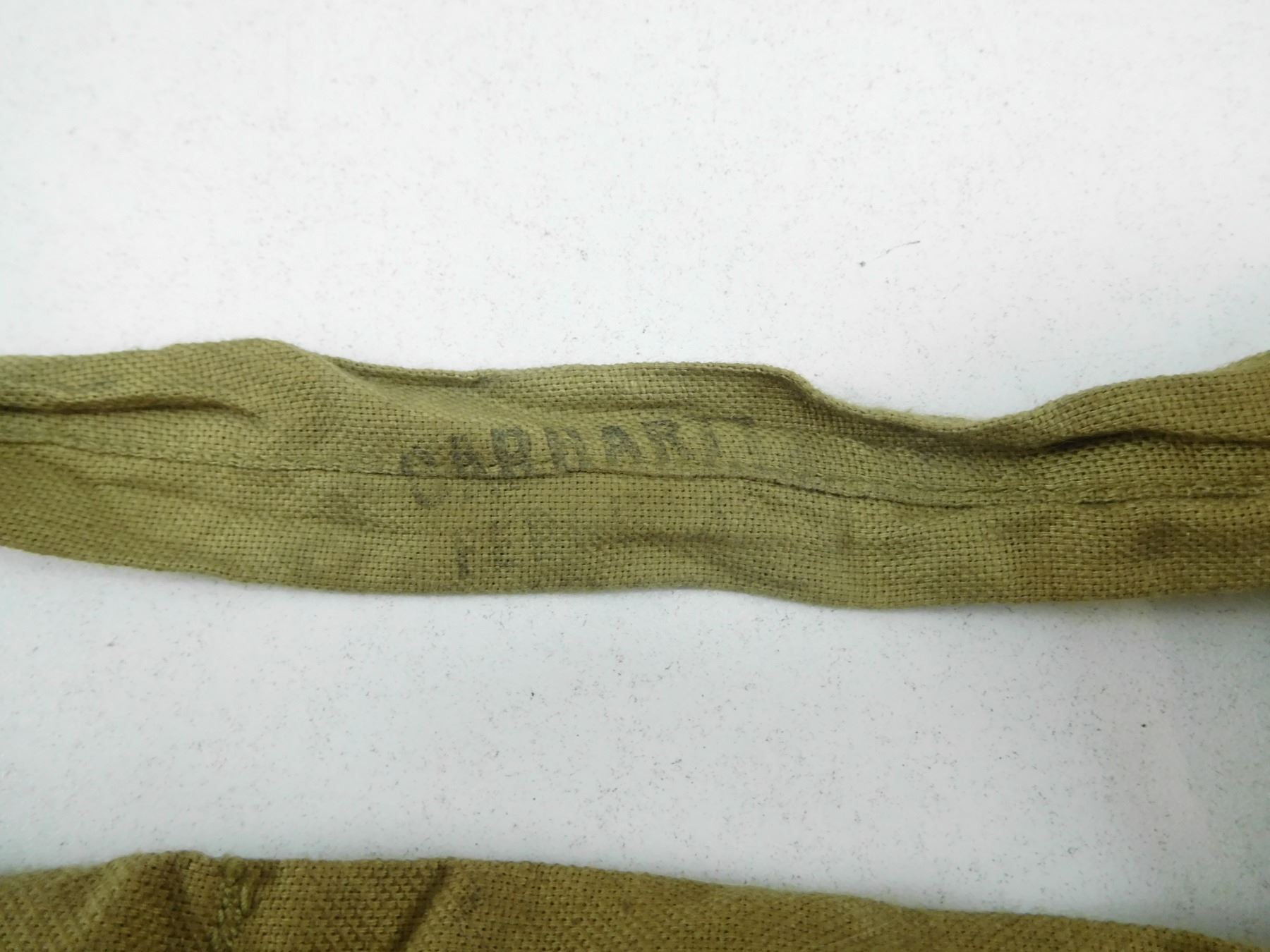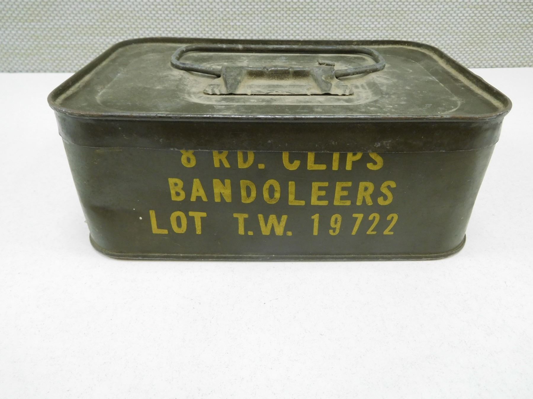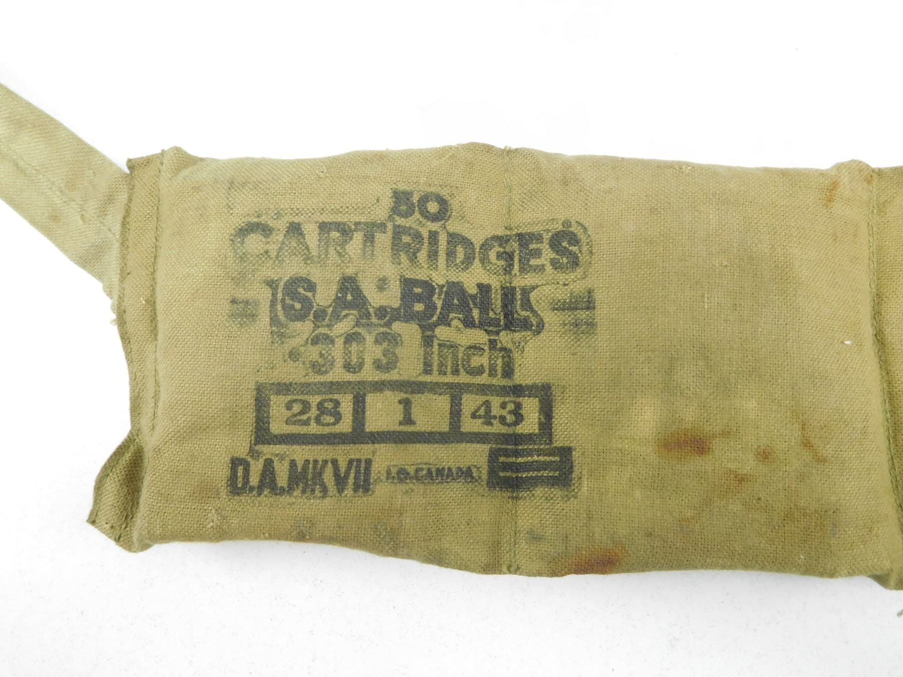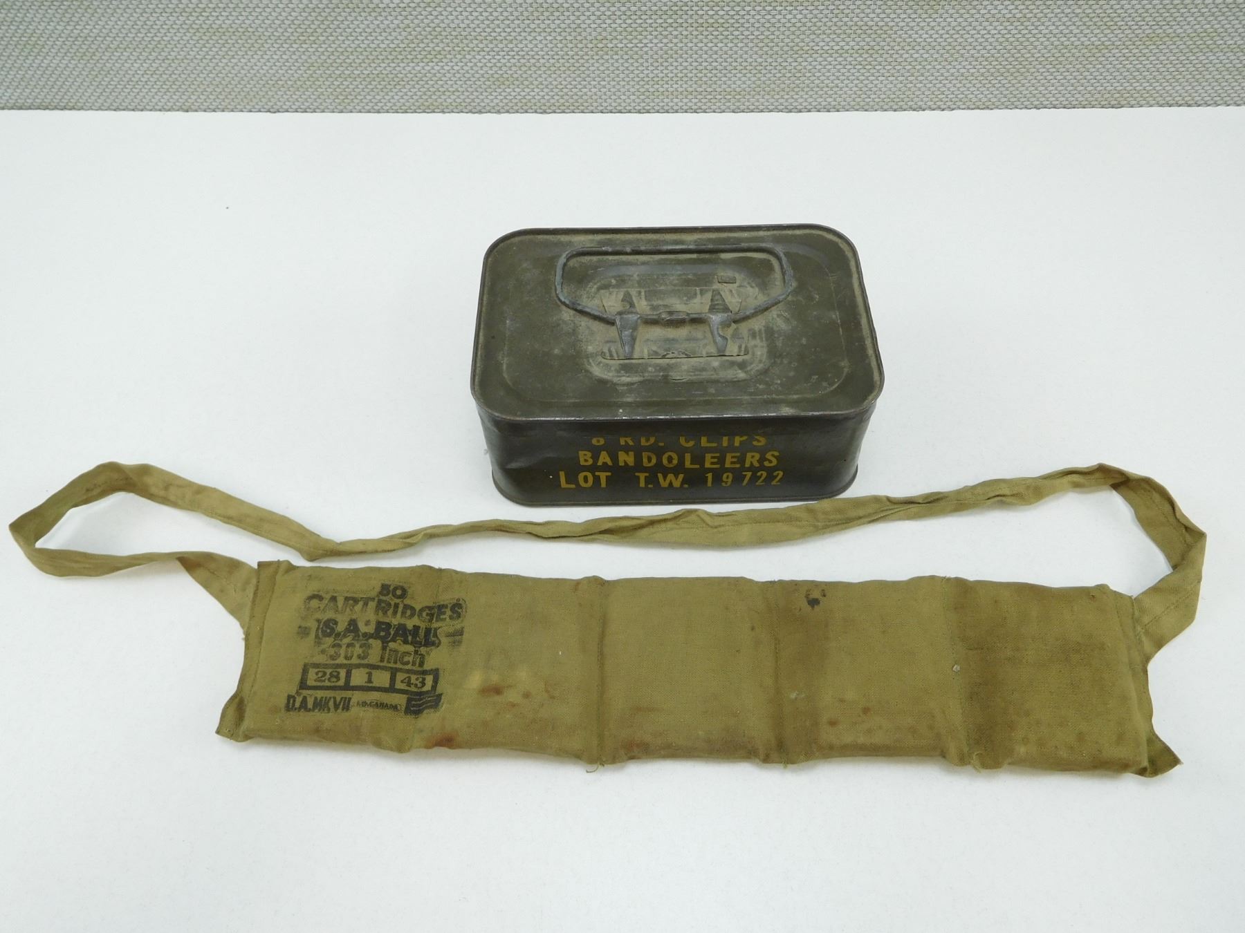 303" S.A. BALL AMMO BANDOLEER & TIN , 45 RNDS IN STRIPPER CLIPS,HEADSTAMPED 1942 BANDOLEER MARKED CARHARTT, 28/1/43, D.A.MKVII, TIN MARKED 8 RD CLIP BANDOLEERS