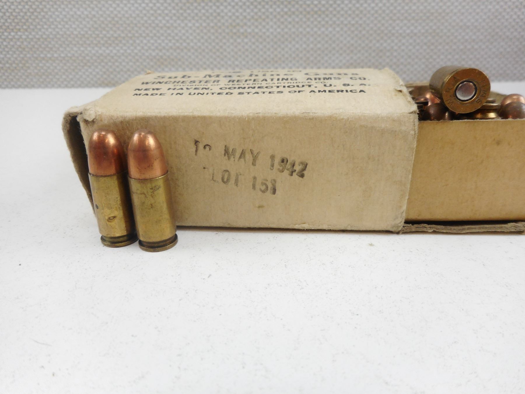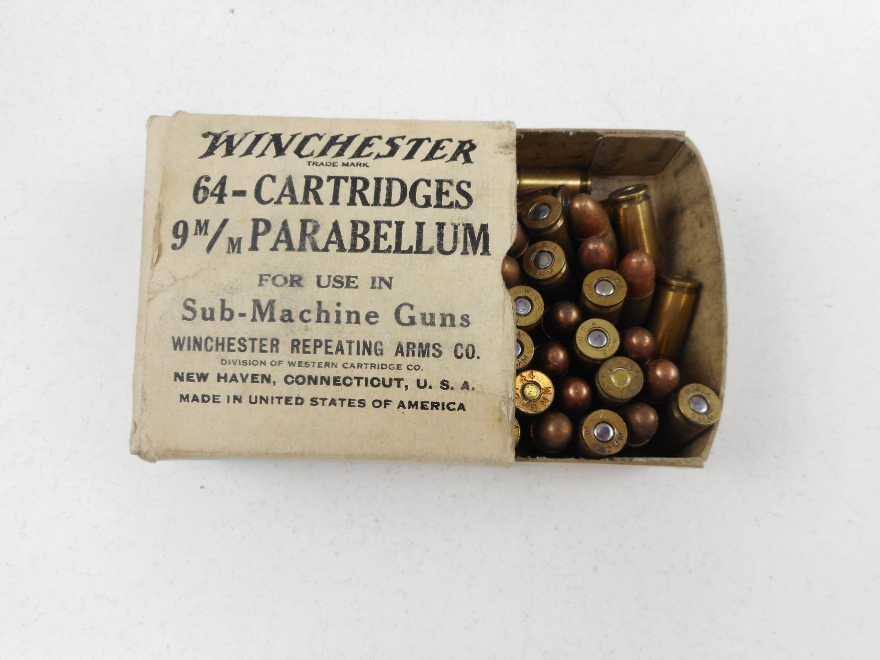 ASSORTED 9MM MILITARY AMMO , 52 RNDS INCLUDES WINCHESTER 9MM PARABELLUM FOR USE IN SUB-MACHINE GUNS & HEADSTAMPS DATED 1944