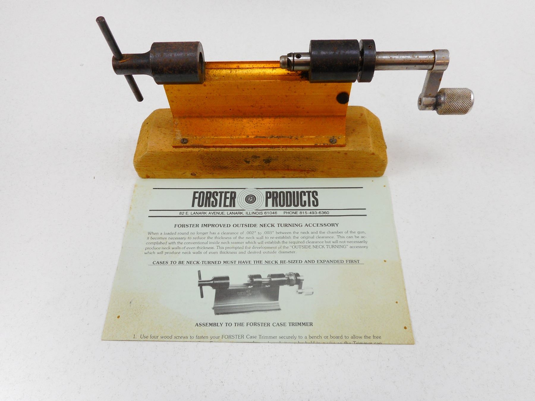 FORSTER PRODUCTS CASE TRIMMER , MOUNTED TO BLOCK WITH INSTRUCTIONS