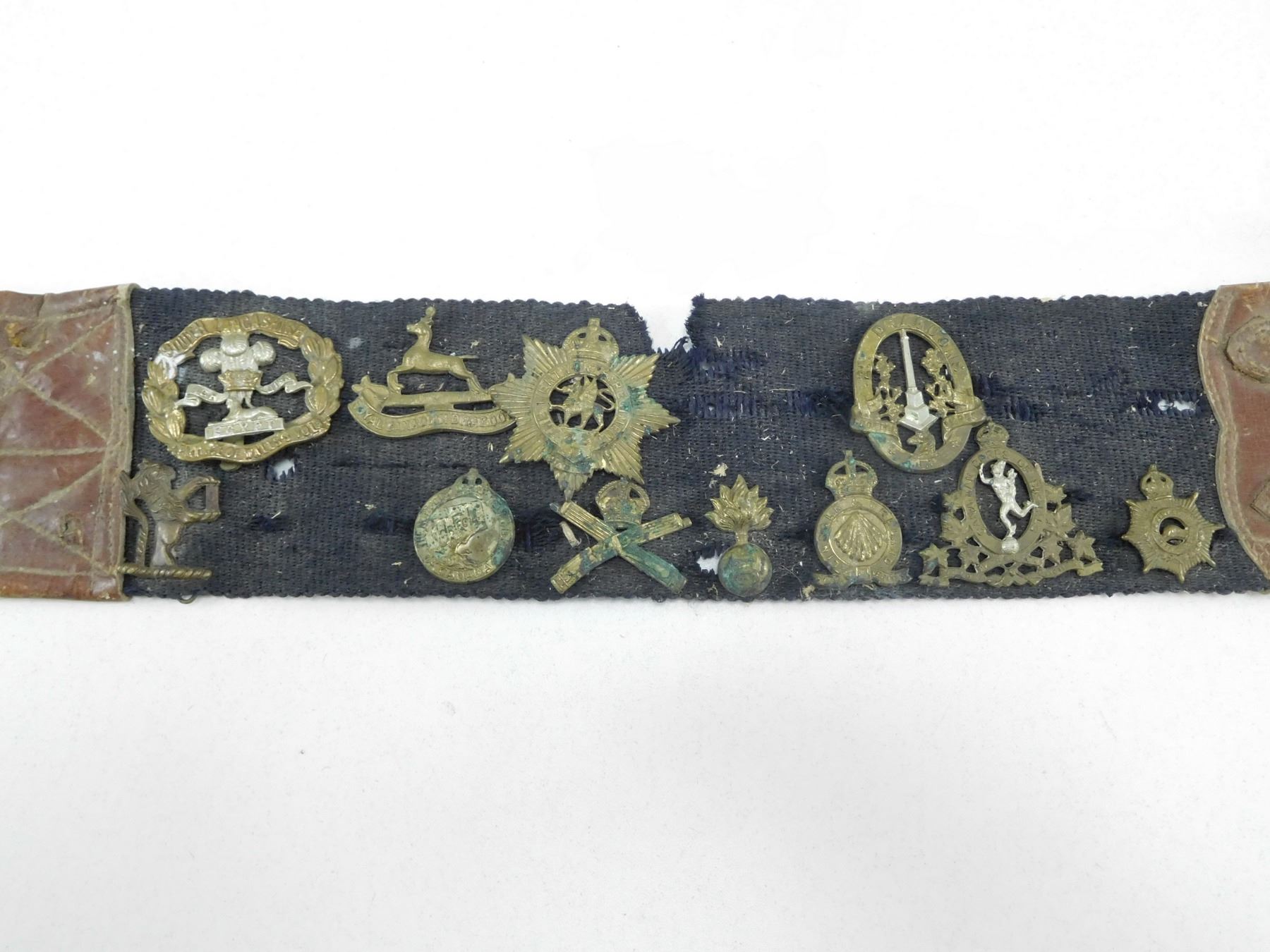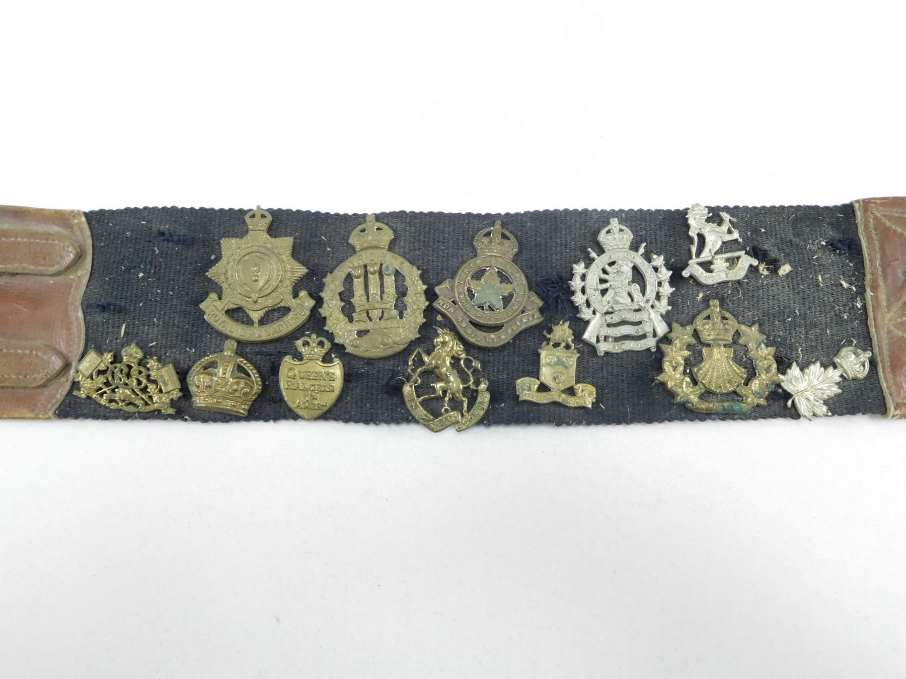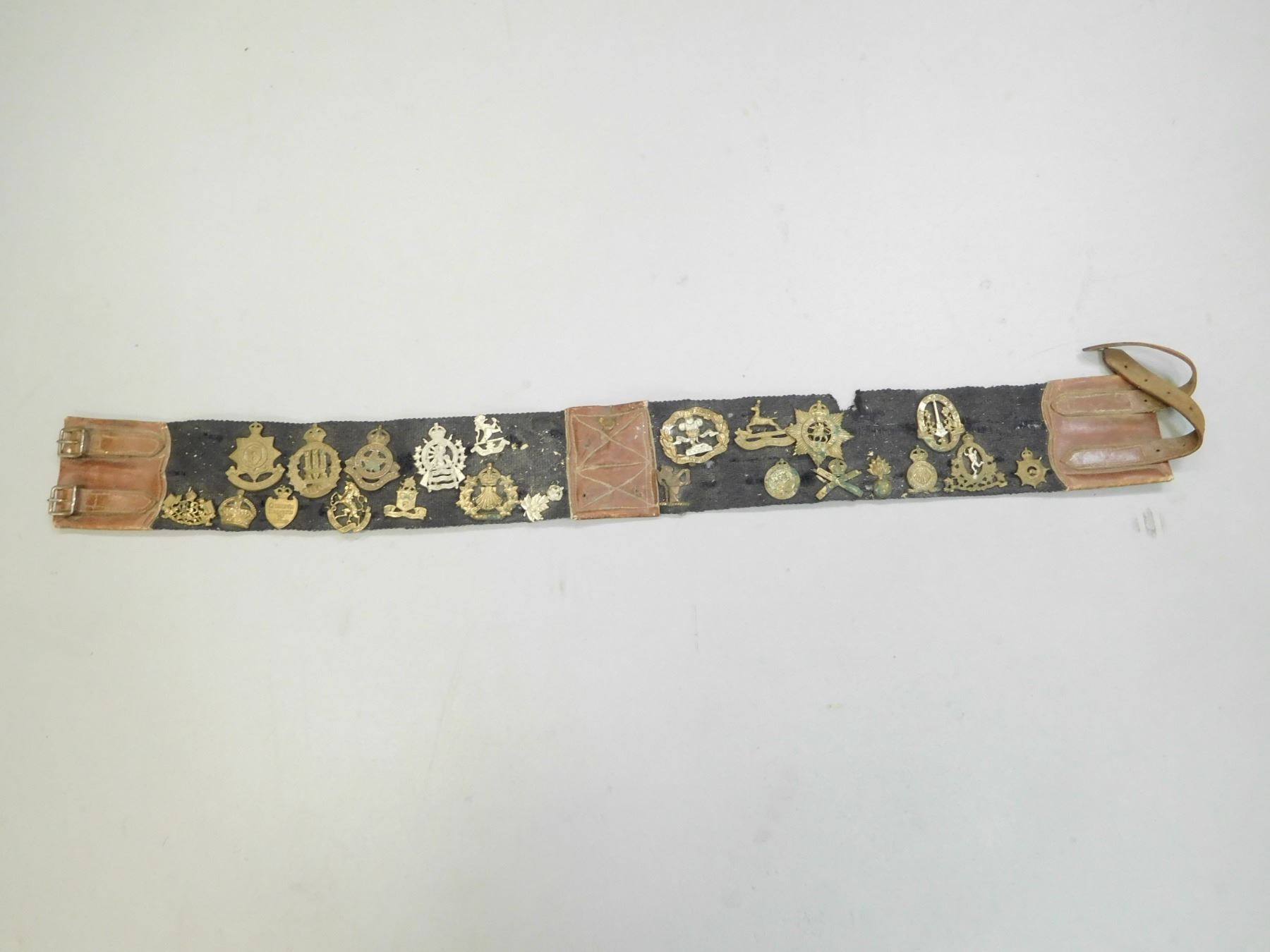 WWI/WWII BELT AND CAP & COLLAR BADGES , BELT IS PARTIALLY FRAYED INCLUDES ASSORTED CAP & COLLAR BADGES, MOSTLY LUG BACK WITH PINS (2) SLIDE FASTENERS