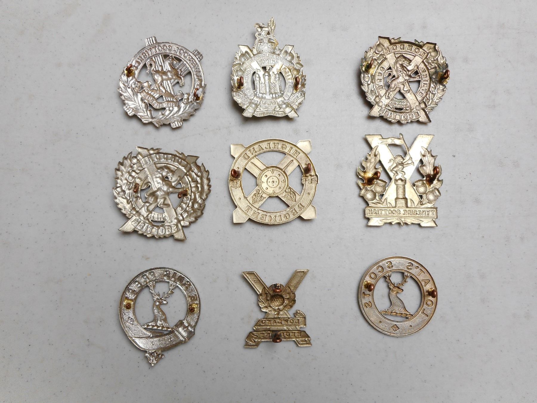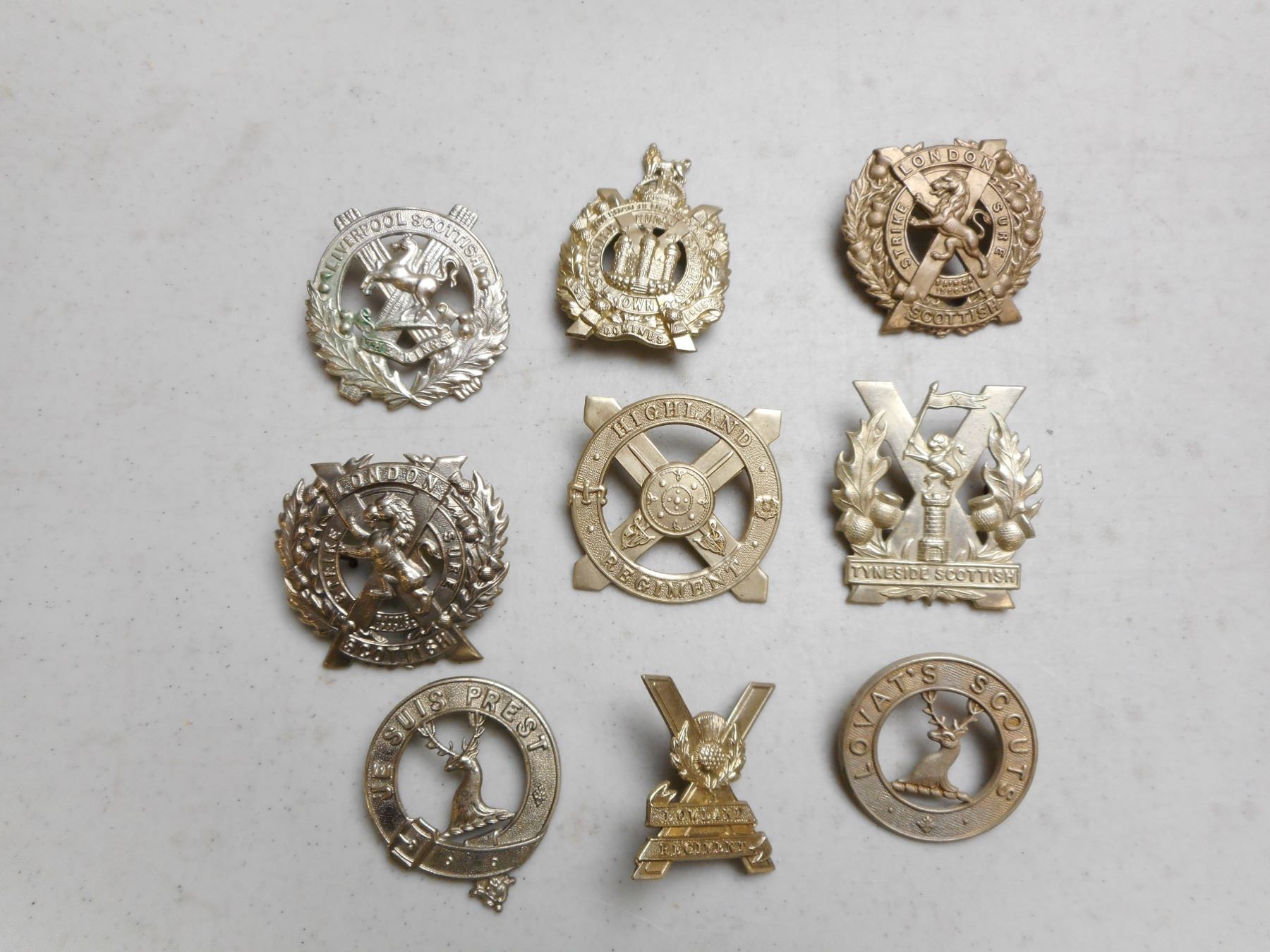 ASSORTED SCOTTISH CAP BADGES , INCLUDES TYNSIDE SCOTTISH, LOVAT'S SCOUTS & CLAN FRASER, HIGHLAND REGIMENT, LOWLAND REGIMENT, LONDON SCOTTISH REGIMENT, KING'S OWN SCOTTISH BORDERERS, LIVERPOOL SCOTTISH