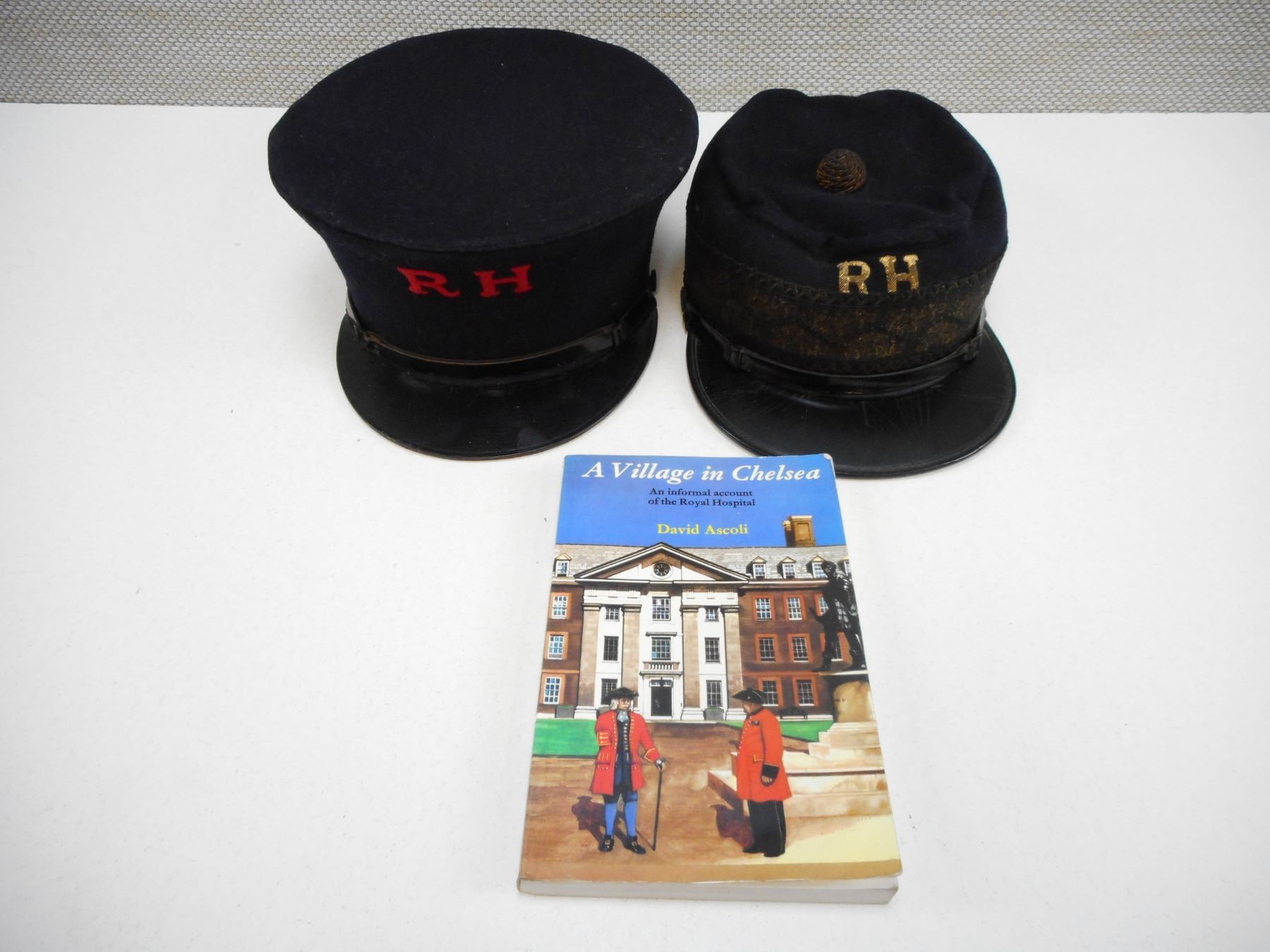 ROYAL HOSPITAL CHELSEA CAPS (CHELSEA PENSIONER'S) , (1) EARLY VERSION: PEAKED CAP WITH KNOTTED BALL TOP AND EMBROIDED BAND GOLD THREAD RH, (1) LATER VERSION: RED EMBROIDED RH, (1) SOFT COVER: A VILLAGE IN CHELSEA- AN INFORMAL ACCOUNT OF THE ROYAL HOSPITAL