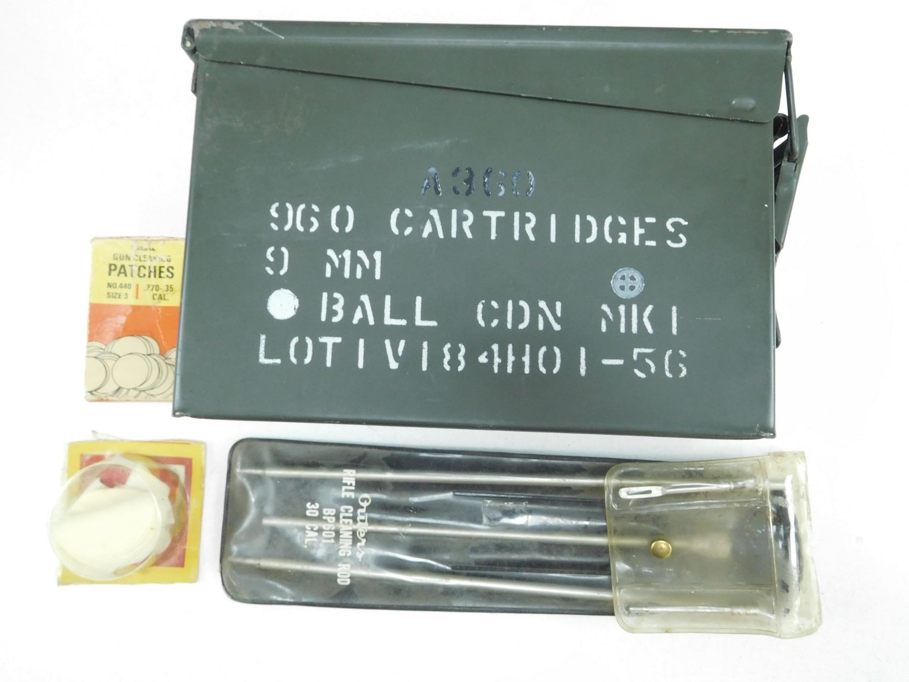 AMMO TIN AND CLEANING SUPPLIES , (1) AMMO TIN 960 CARTRIDGES 9MM BALL CDN MKI APPROX SIZE 10 X 7.5 X 3.5", INCLUDES PATCHES & CLEANING ROD