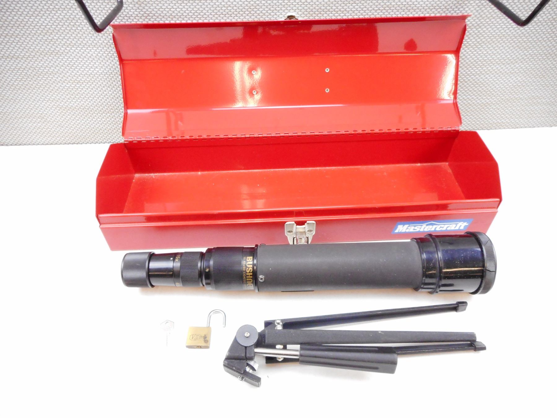BUSHNELL 15-45X50 SPOTTING SCOPE , GOOD VISIBILITY, SMALL CRACK IN LENS CAP, INCLUDES TRIPOD, AND TOOL BOX WITH KEY