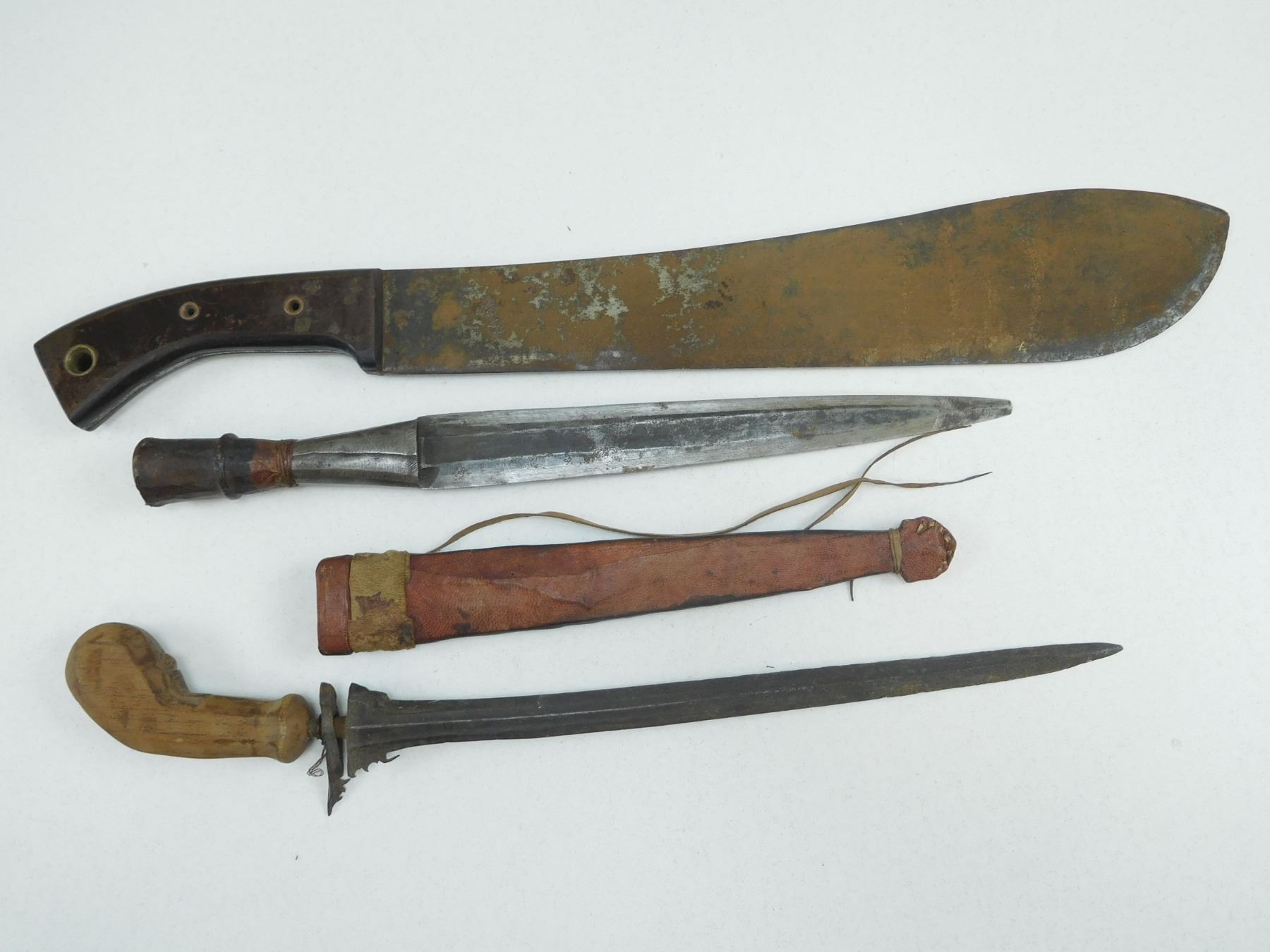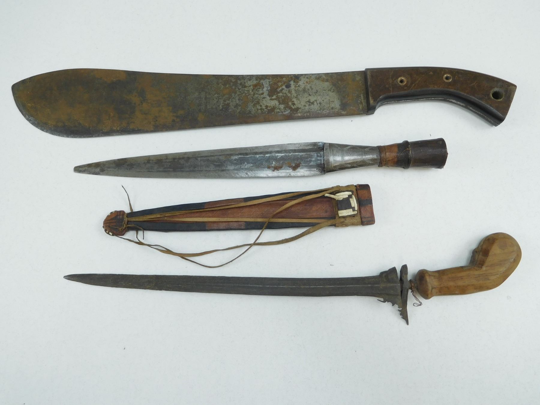 ASSORTED BLADES , (1) LEGITIMUS COLLINS & CO MACHETE, (1) WOODEN HANDLE, (1) WITH LEATHER SHEATH, LOT OF 3