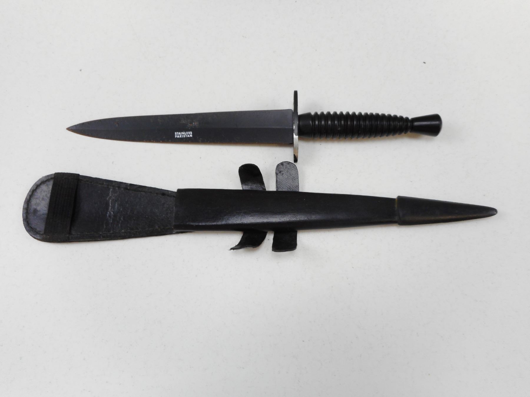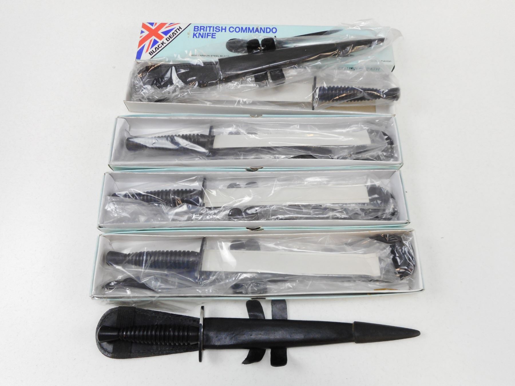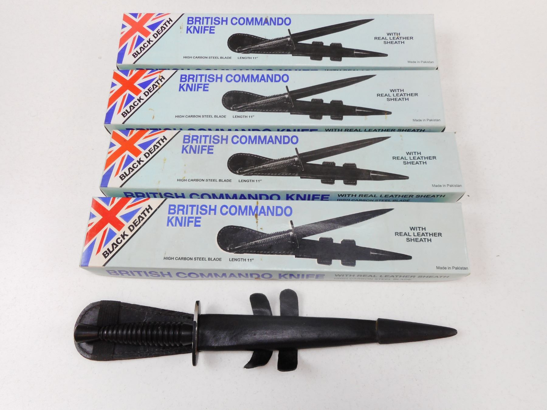 BRITISH COMMANDO KNIFE , ALL WITH SHEATHS : (4) WITH BOXES, (1) WITHOUT BOX, LOT OF 5
