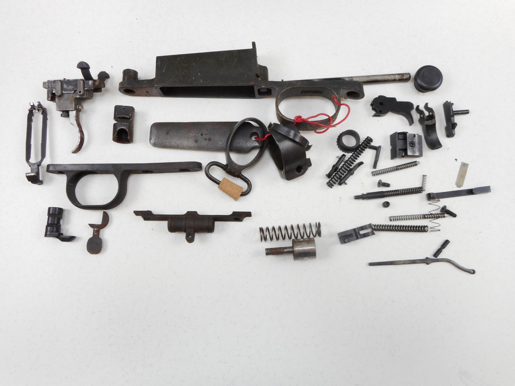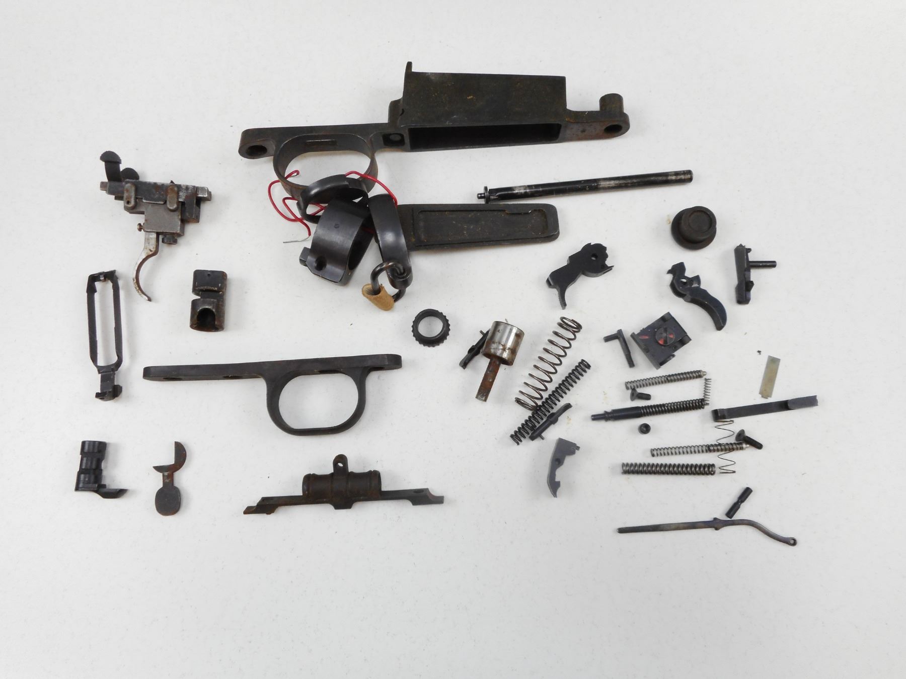 ASSORTED GUN PARTS , INCLUDES TRIGGER GUARDS, TRIGGER, SPRINGS, SEE PHOTO