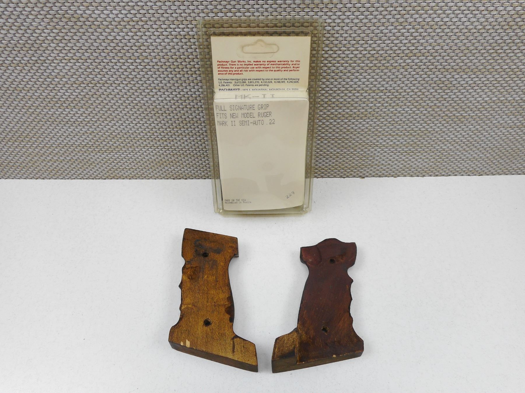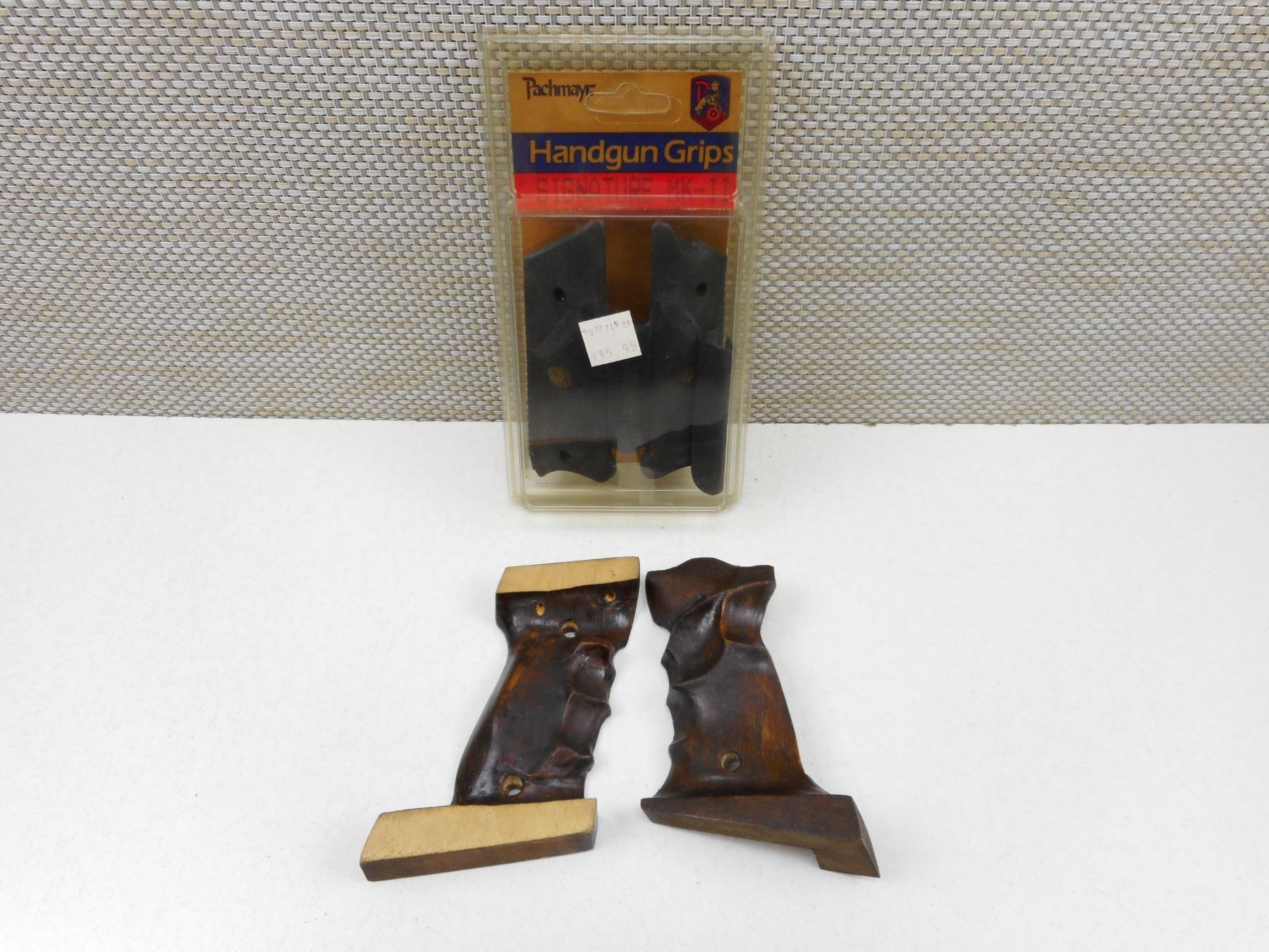 HANDGUN GRIPS , (1) WOODEN HANDGUN GRIPS, (1) PACHMAYR SIGNATURE MK-11 IN ORIGINAL PACKAGE, LOT OF 2