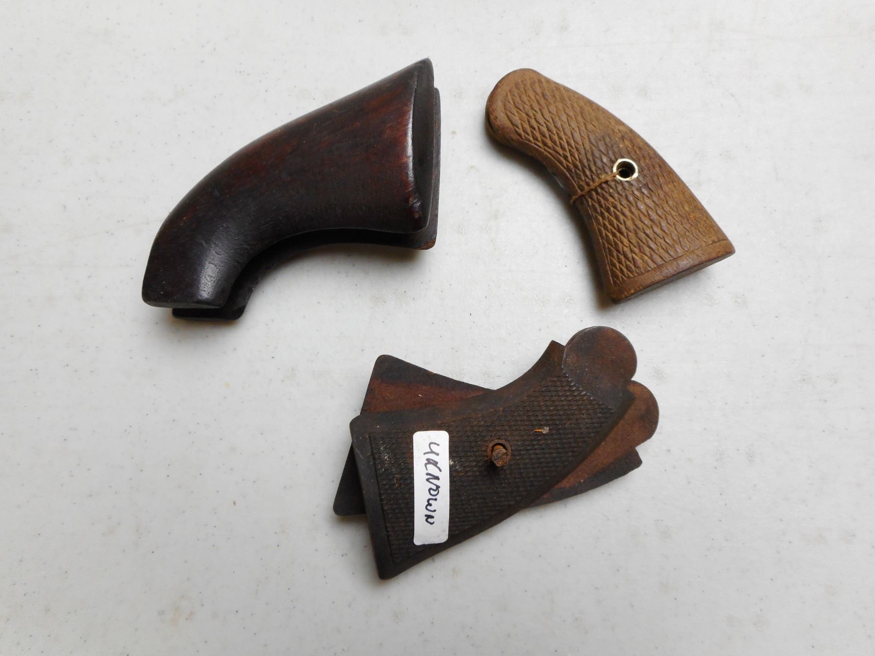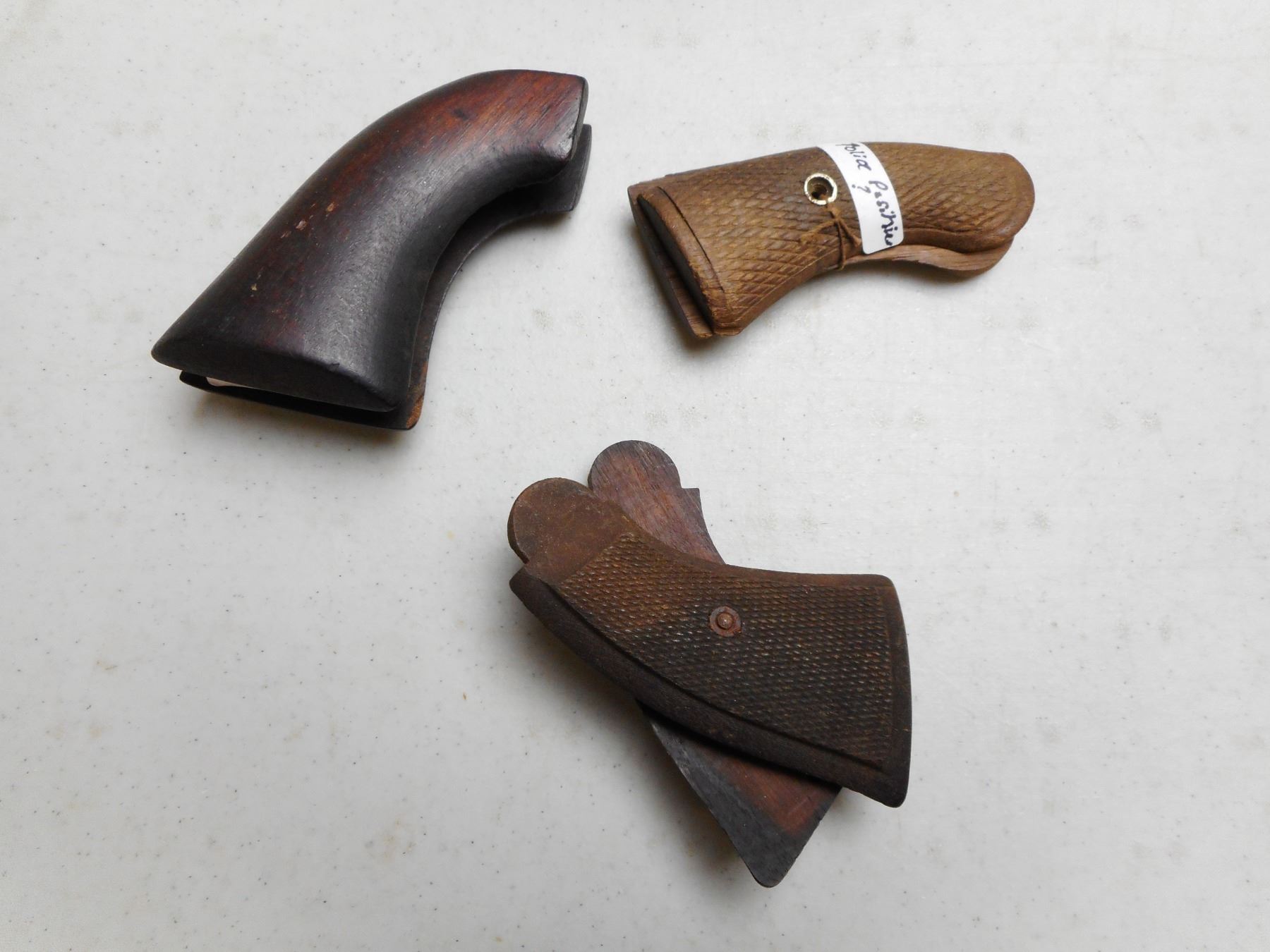 ASSORTED HANDGUN GRIPS , ALL WOODEN (1) POSSIBLY FOR COLT POLICE POSTIVE, (1) FOR COLT SAA, (1) UNKNOWN, LOT OF 3